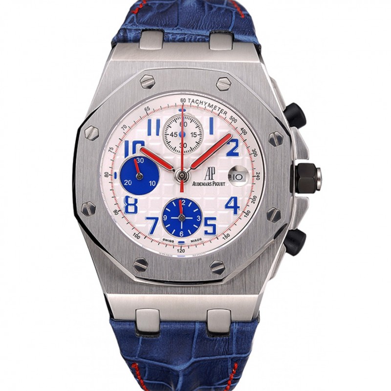 Svizzera Audemars Piguet Royal Oak Offshore quadrante bianco Cassa in acciaio Cinturino in pelle blu 622.850
