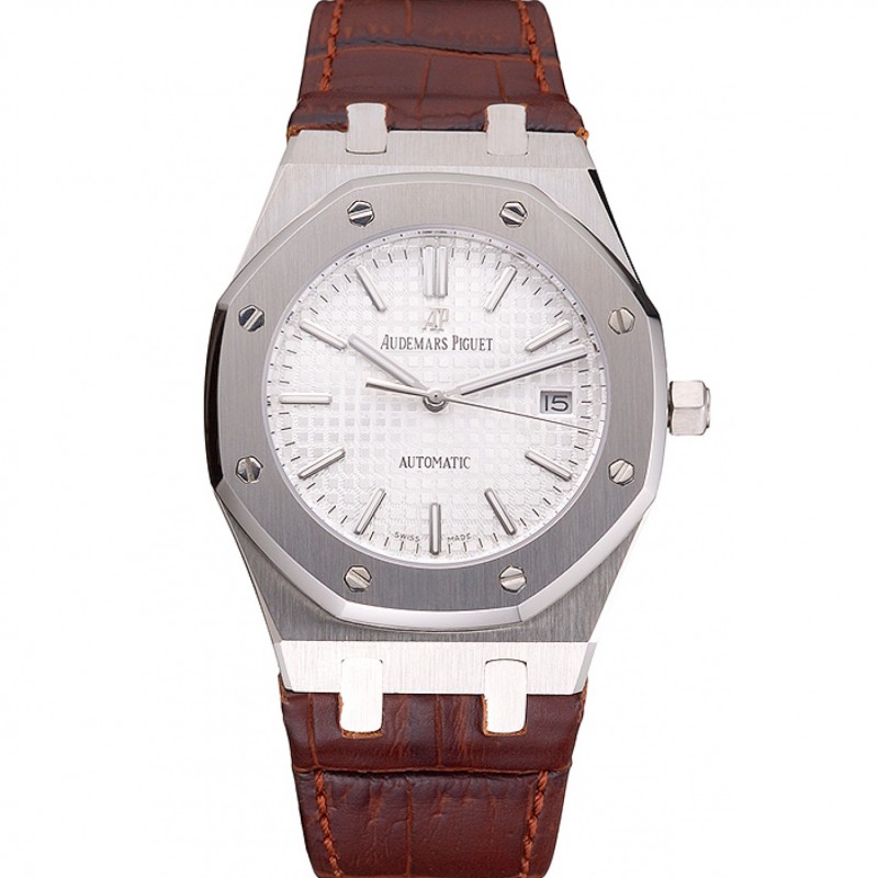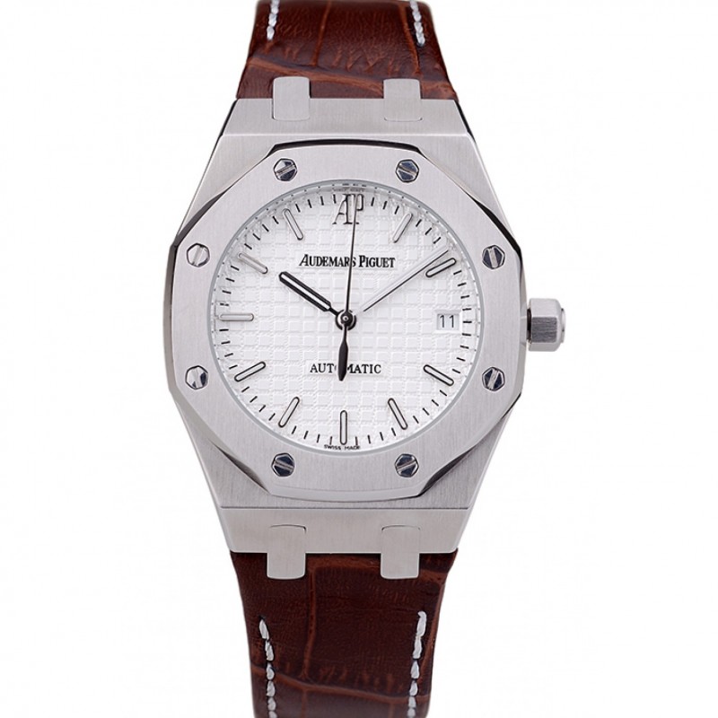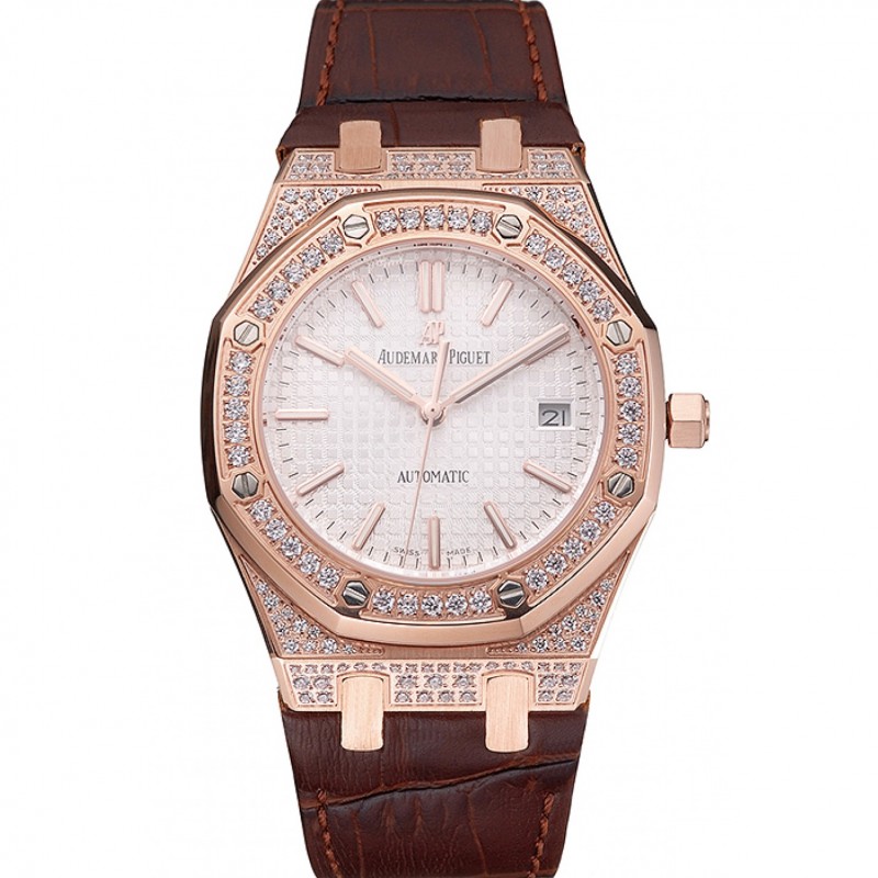 Svizzera Audemars Piguet Royal Oak quadrante bianco cassa in oro con diamanti cinturino in pelle marrone