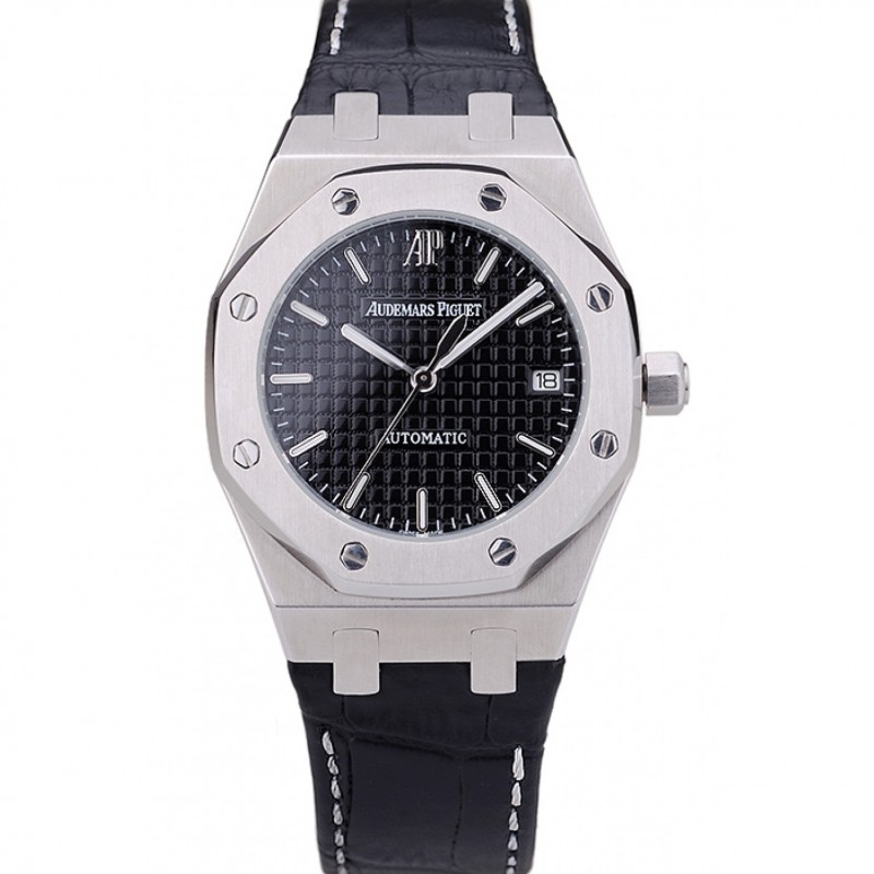 Svizzera Audemars Piguet Royal Oak Quadrante nero Cassa in acciaio con diamanti cinturino in pelle nera