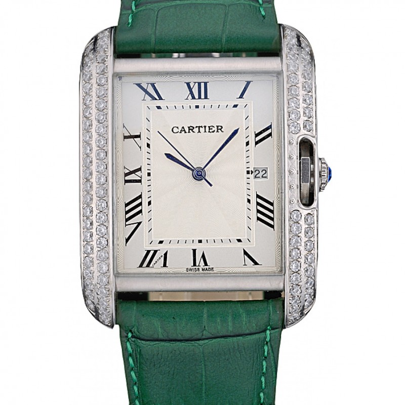 Cartier Tank Anglaise 36 millimetri quadrante bianco diamanti Bracciale in pelle cassa in acciaio verde