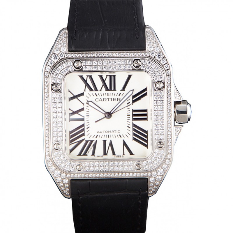 Svizzera Cartier Santos argento lunetta con diamanti e pelle nera Cinturino sct47 621.531