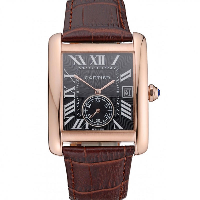 Cartier Tank MC quadrante nero cassa in oro cinturino in pelle marrone 622.582