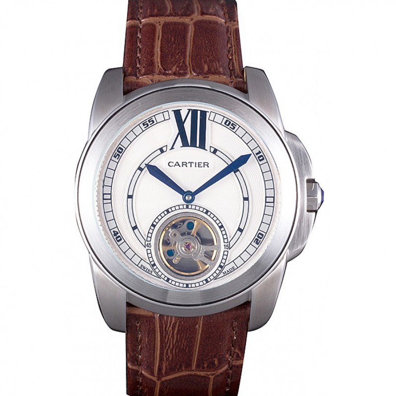 Calibro Cartier tourbillon volante quadrante bianco Bracciale in pelle Cassa in acciaio Brown