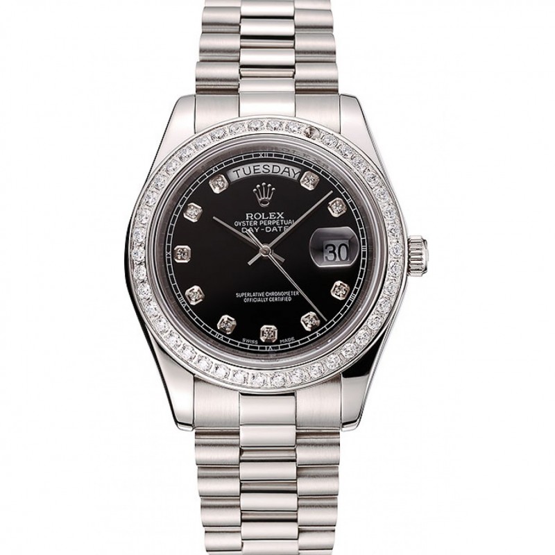 Rolex Day-Date Svizzero quadrante nero braccialetto di diamanti cassa del diamante Numeri in acciaio inox 1453966