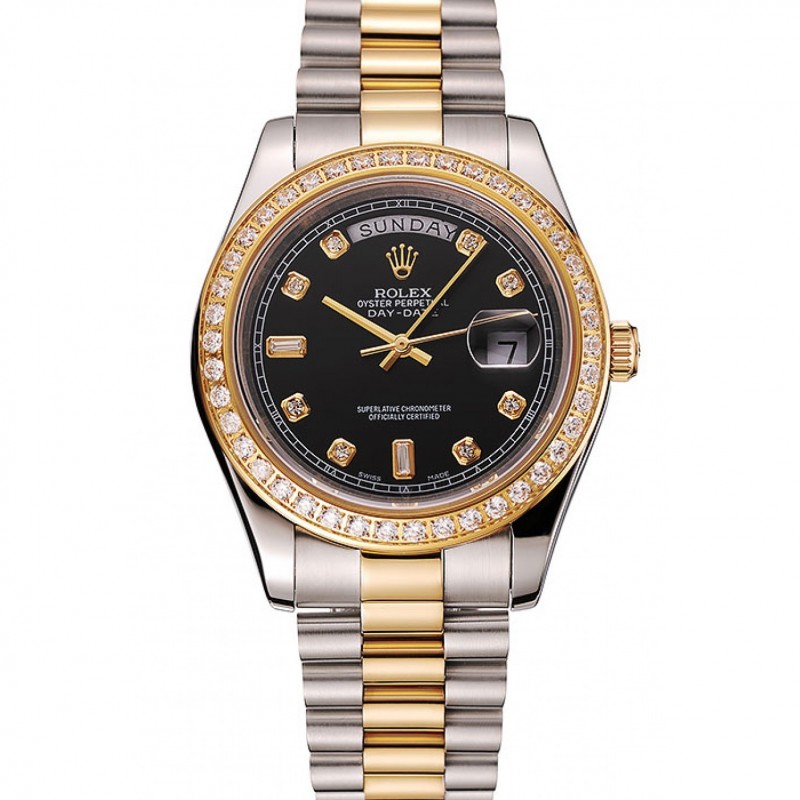 Rolex Day-Date Svizzero quadrante nero cassa del diamante in oro due toni Bracciale in acciaio inossidabile 1453976