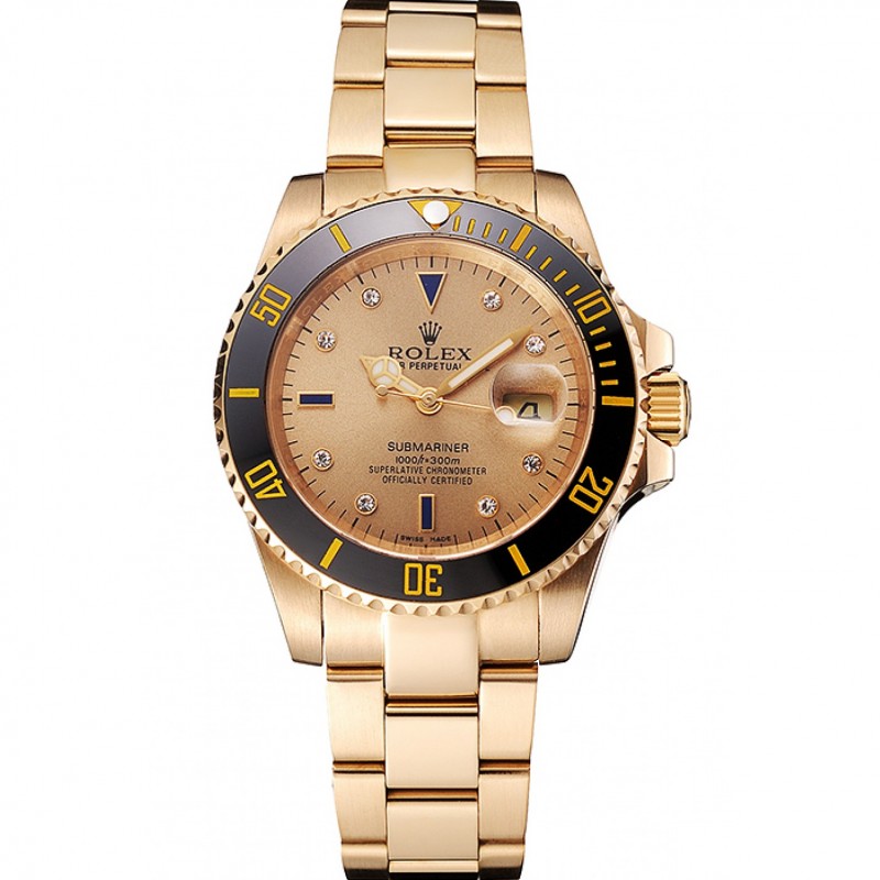 Svizzero Rolex Submariner in oro quadrante con diamanti Marcature cornice nera Giallo cassa e bracciale in oro