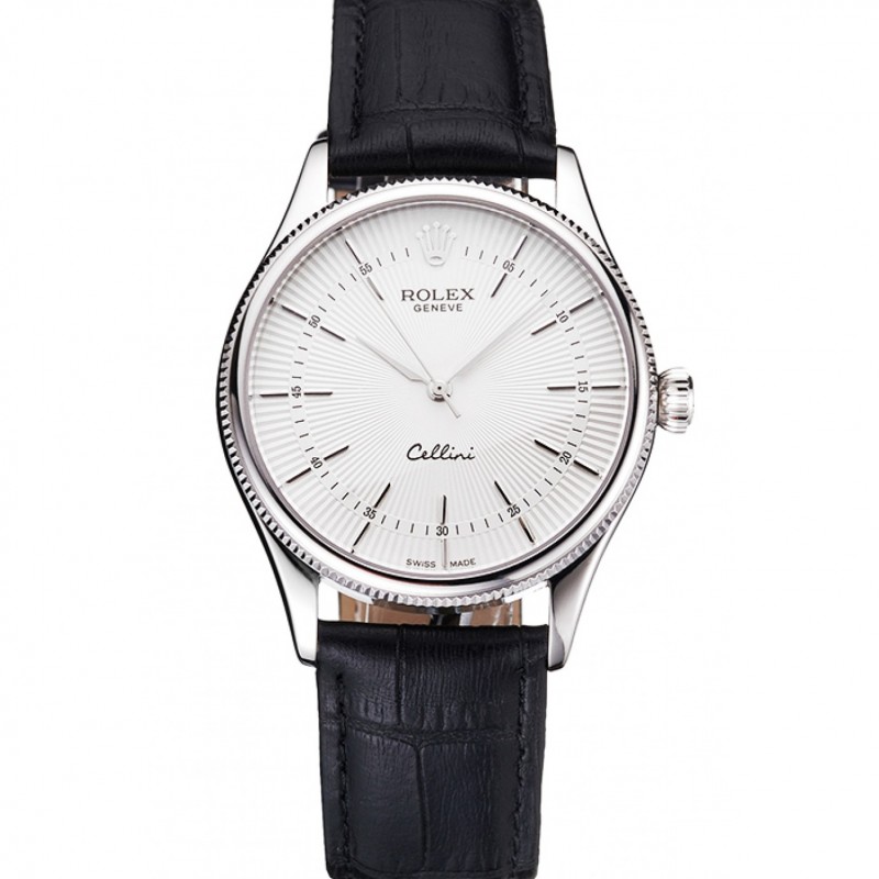 Svizzero Rolex Cellini Bianco guilloché Cassa in acciaio nero cinturino in pelle
