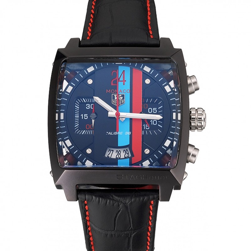 Tag Heuer Monaco Calibre 36 blu e rosso Dial Stripes pelle Quadrante nero Cinturino 622.272