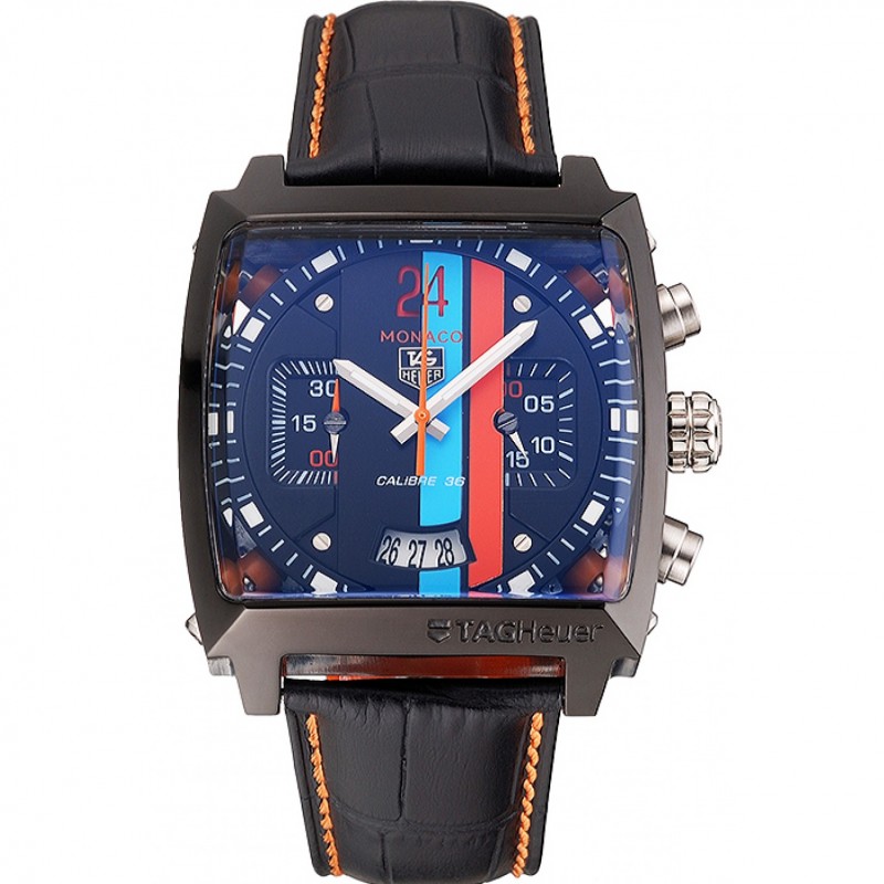 Tag Heuer Monaco Calibre 36 blu e arancione Stripes pelle Quadrante nero Cinturino 622.302