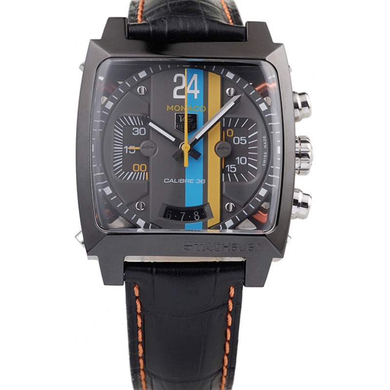 Tag Heuer in pelle svizzero Monaco quadrante nero cinturino blu-giallo a strisce nero
