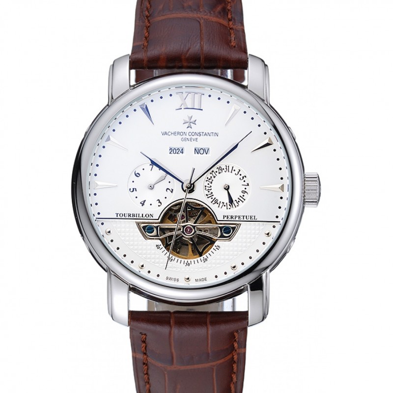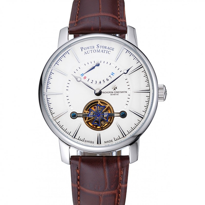 Vacheron Constantin Tourbillion Power Reserve quadrante bianco il braccialetto di cuoio di caso Marrone Argento 1454275