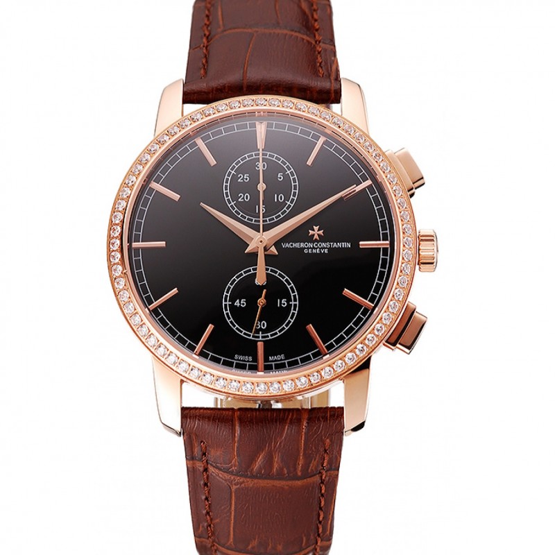 Svizzero Vacheron Constantin Patrimony Traditionnelle Cronografo Quadrante Nero Diamante Lunetta cassa in oro rosa cinturino in pelle marrone 1453765