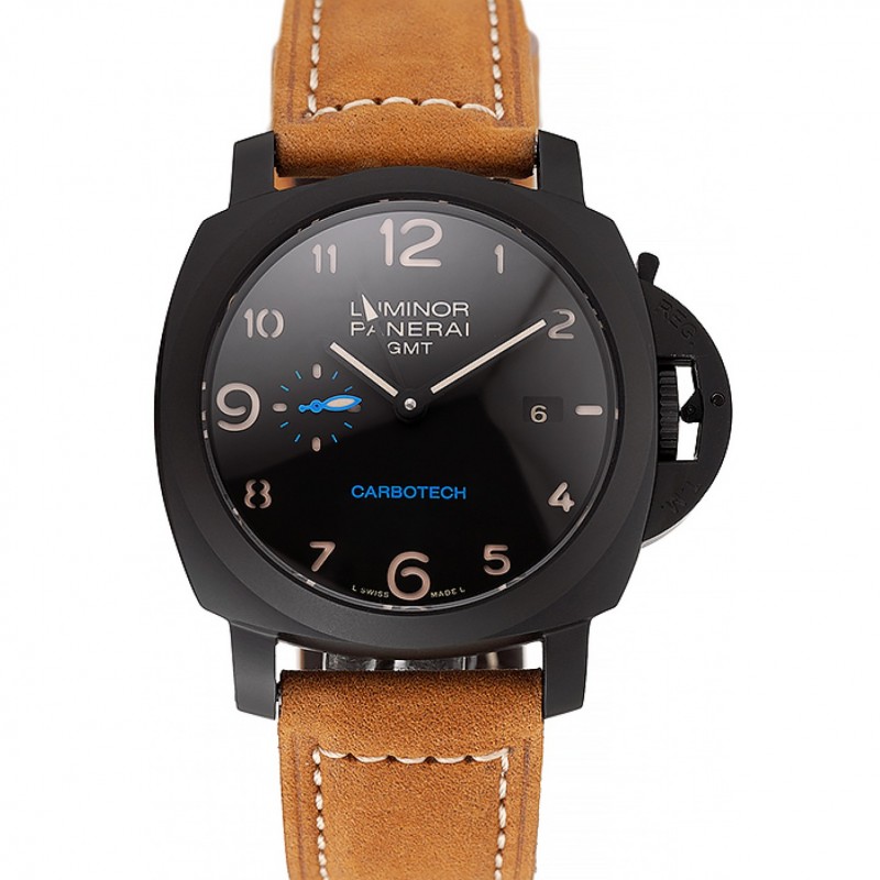 Svizzero Panerai Luminor GMT Carbotech quadrante nero Caso Marrone Nero cinturino in pelle