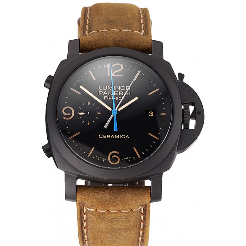 Svizzero Panerai Luminor Flyback Chronograph Ceramica quadrante nero Caso Marrone Nero cinturino in pelle