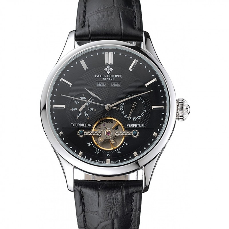 Patek Philippe Giorno Data Tourbillon quadrante nero Cassa in acciaio cinturino in pelle nera 622.839