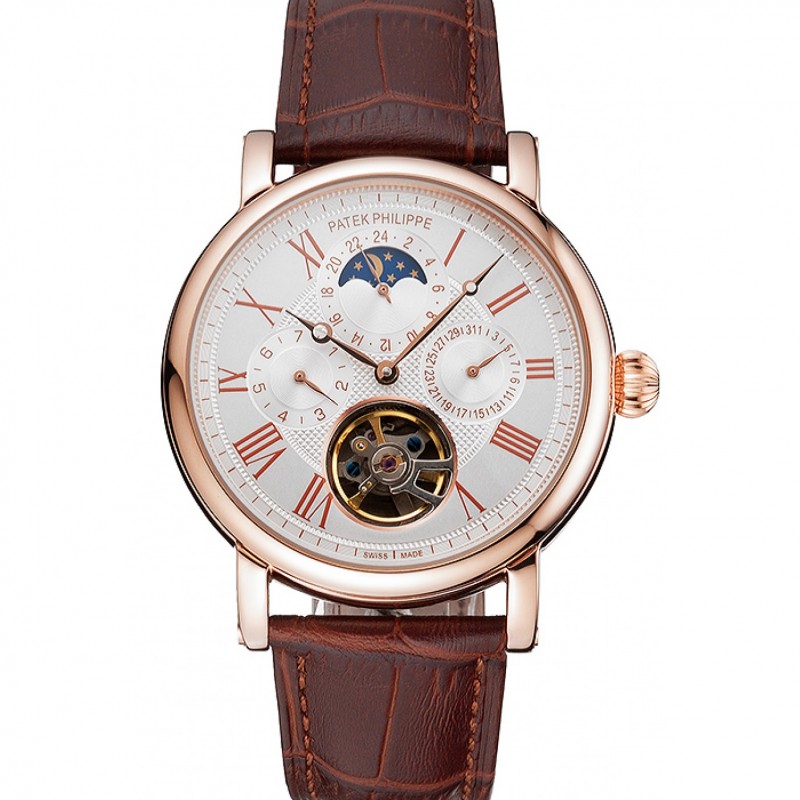Patek Philippe Grand Complicazioni Moonphase Tourbillon Calendario Perpetuo quadrante bianco cassa in oro rosa cinturino in pelle marrone