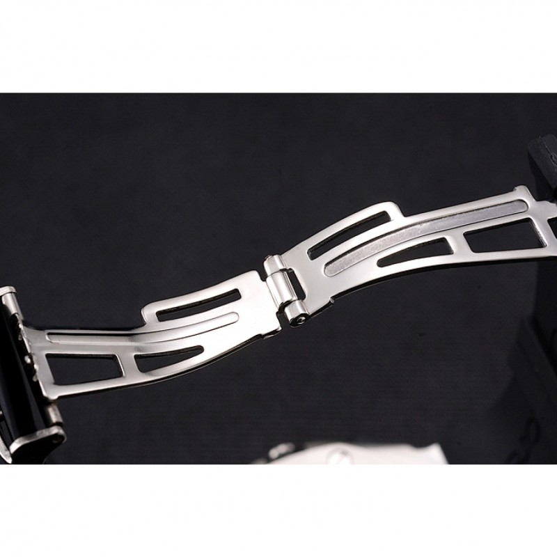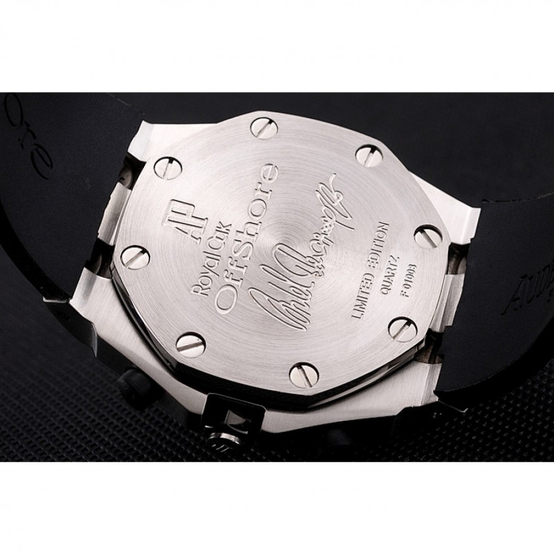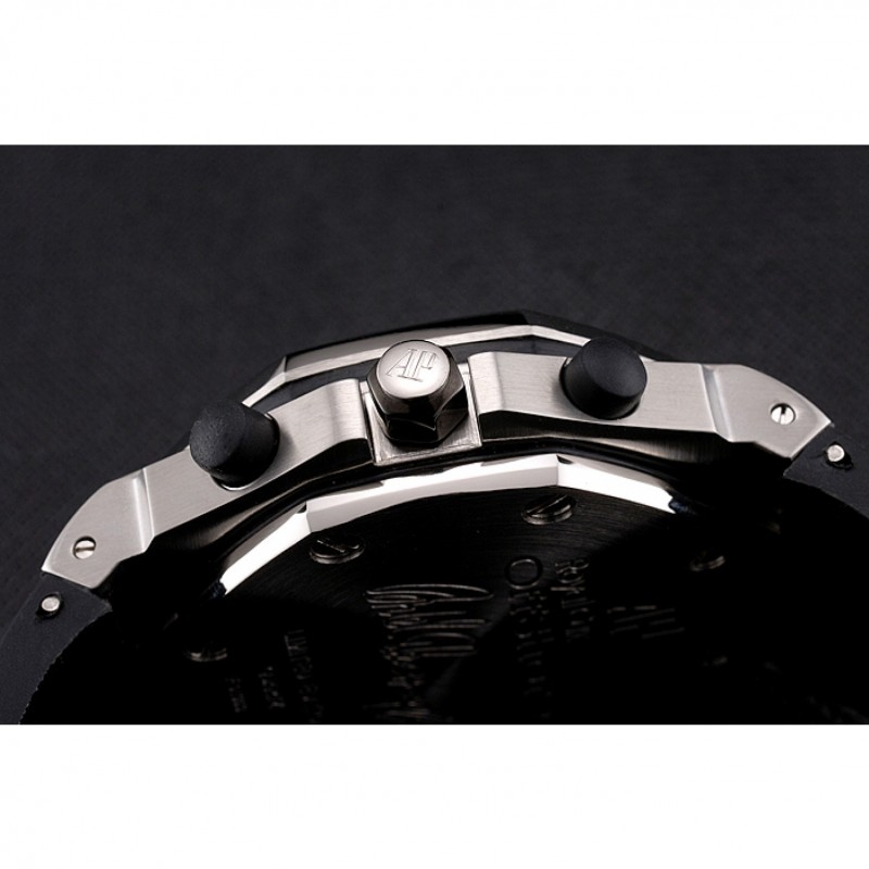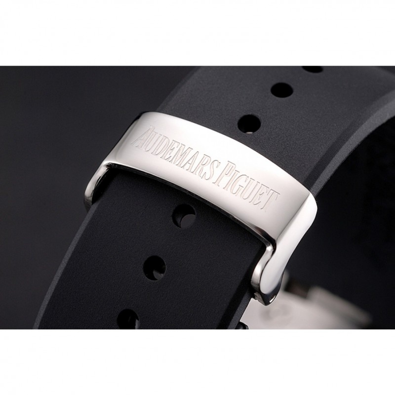 Corona: Audemars Piguet logo inciso lucido corona intaglio in acciaio inox con un giro in gomma nera pulsante corona su entrambi i lati di esso