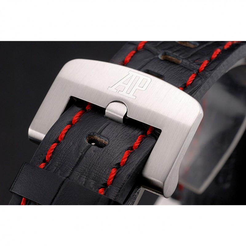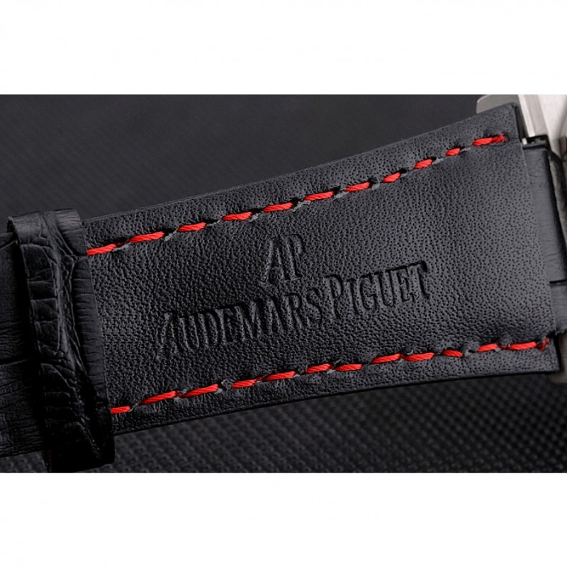 braccialetto: Audemars Piguet e logo calore impresso cinturino in coccodrillo nero con cuciture filo rosso e Audemars Piguet logo inciso acciaio inossidabile spazzolato catenaccio del gancio fibbia