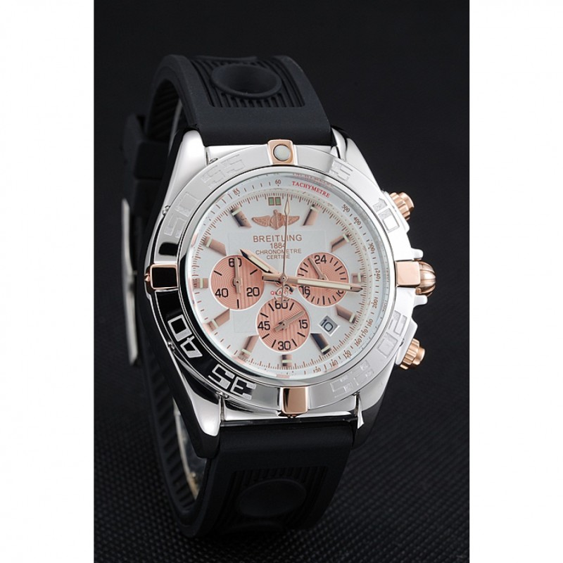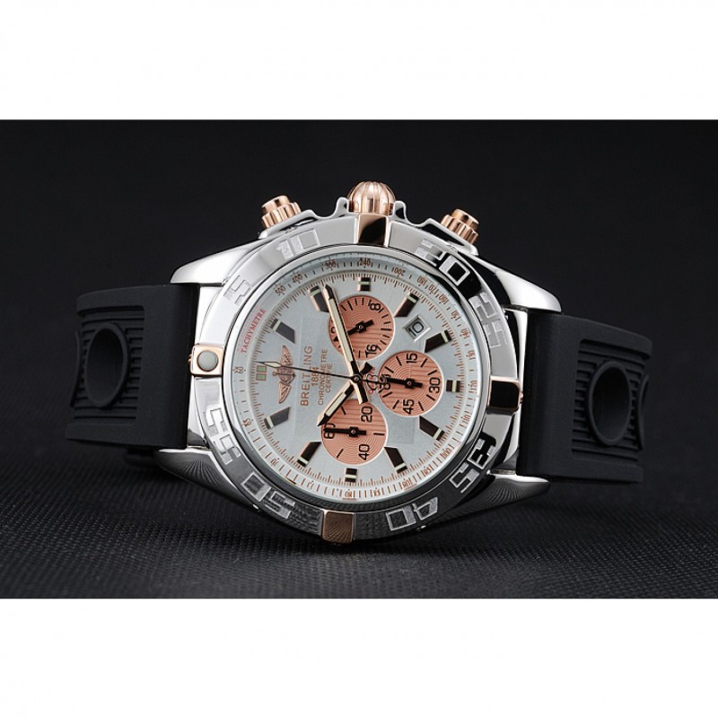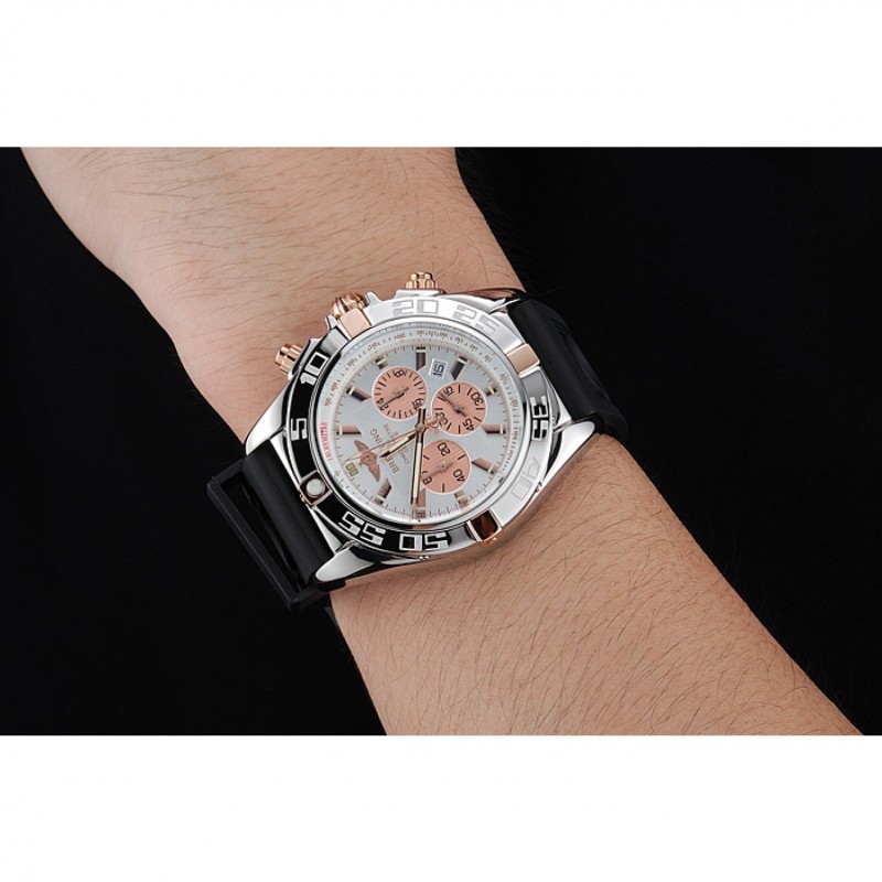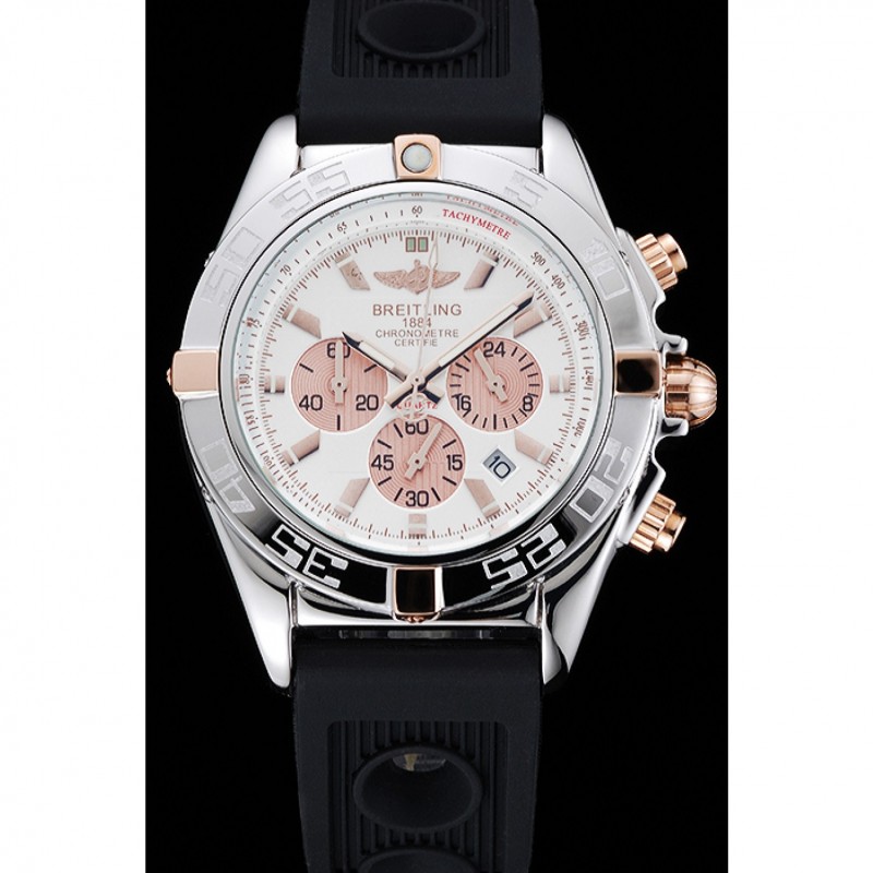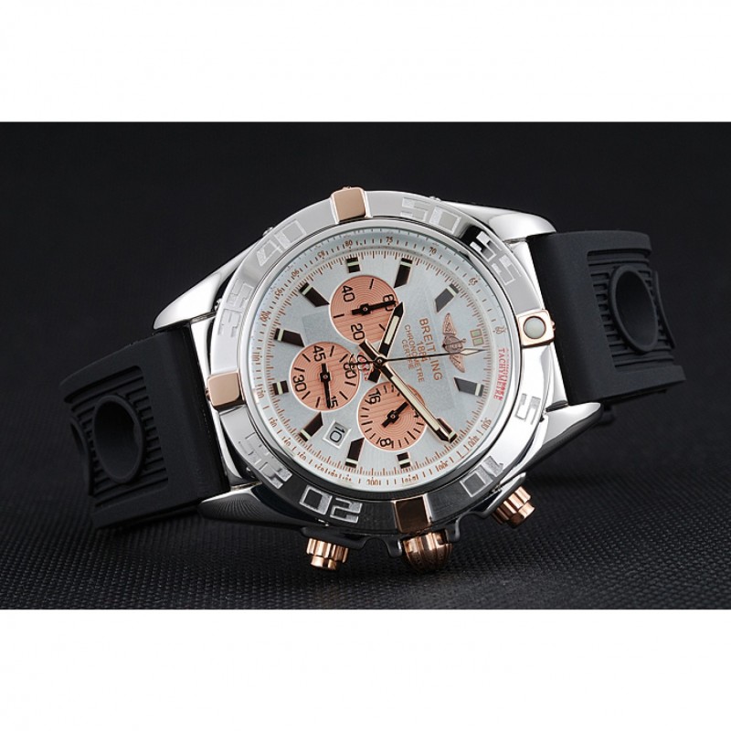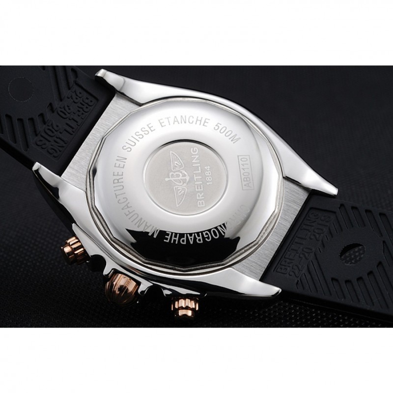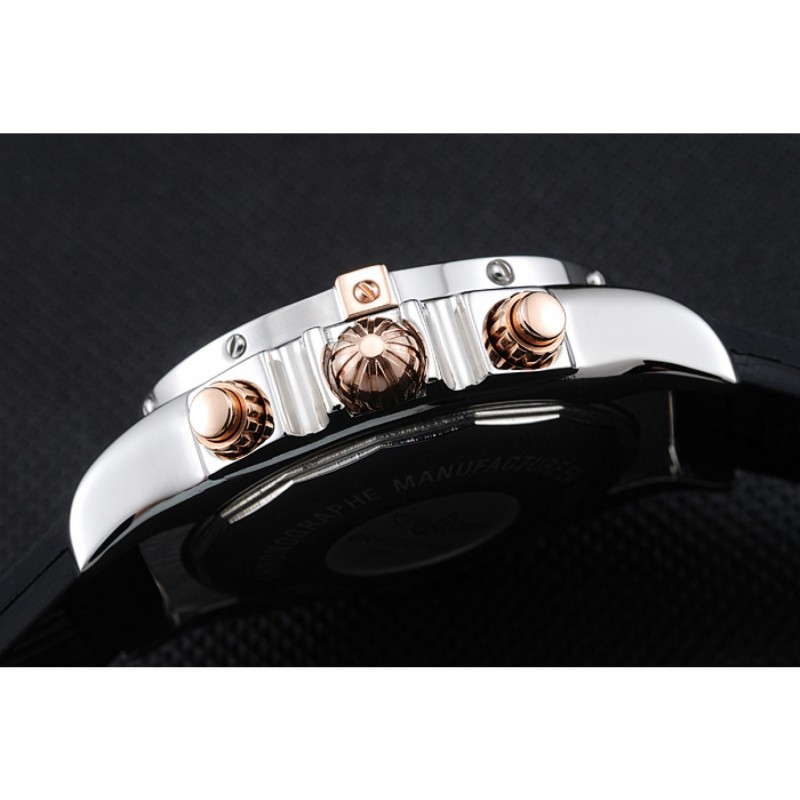 lunetta: lucidato lunetta in acciaio inox punti di riferimento con 3, 6, 9 e 12 ore rosa-oro e inciso minuto placcato 18k oro rosa acciaio corona intaglio inossidabile con Breitling logo e due corone più piccoli su entrambi i lati di esso: marcature