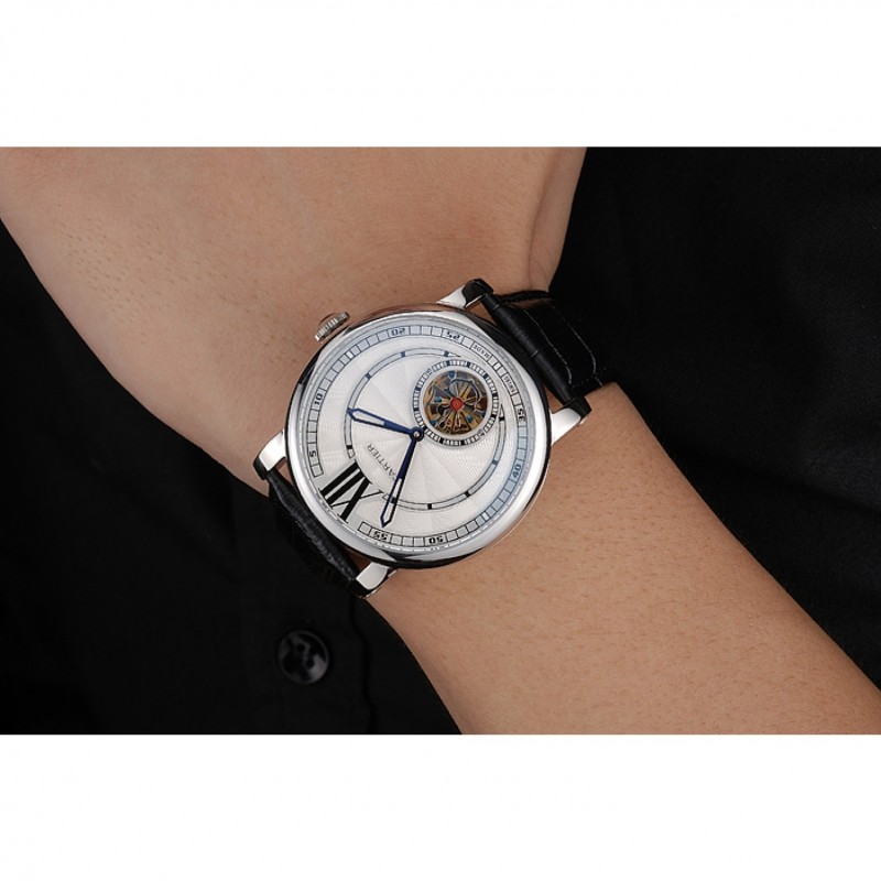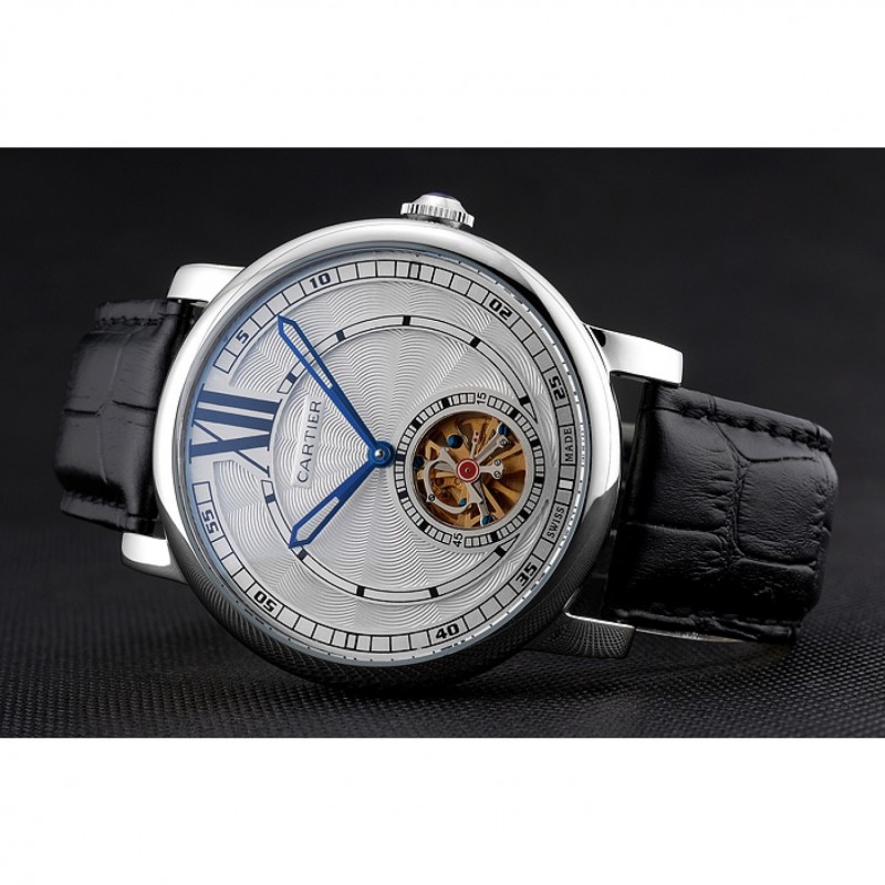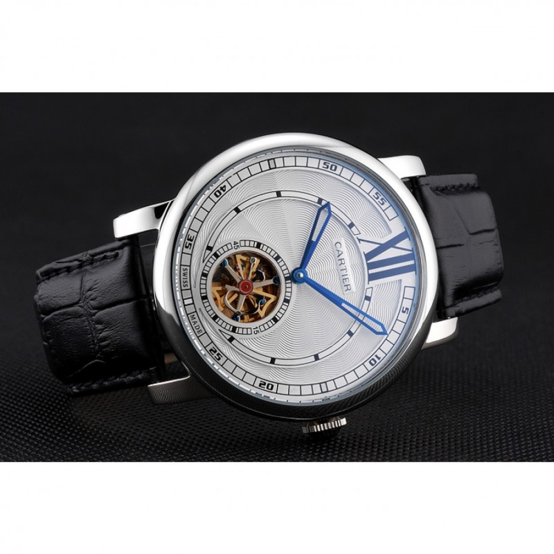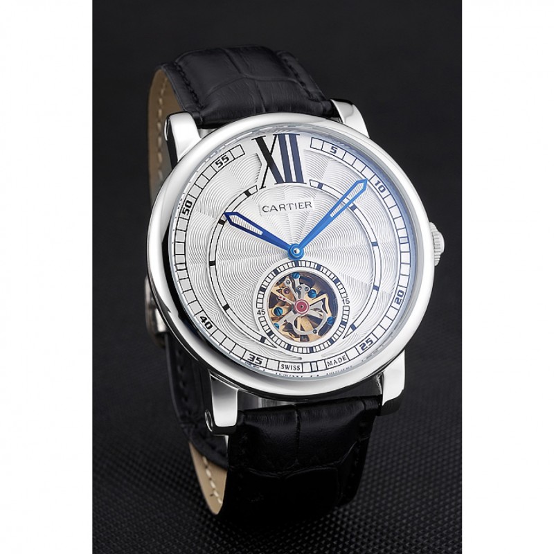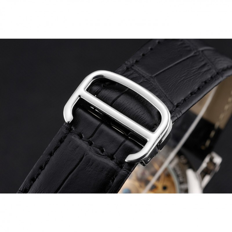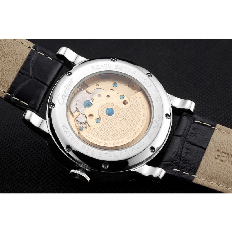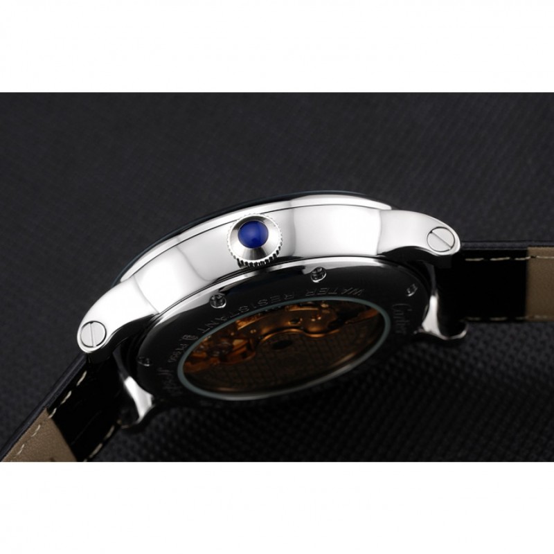 Indietro: acciaio inossidabile lucidato avvitato indietro con meccanica trasparenti rivelando center e Cartier iscrizione