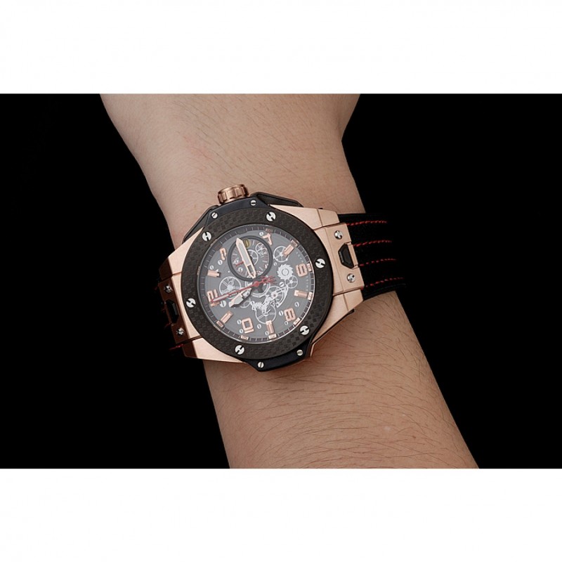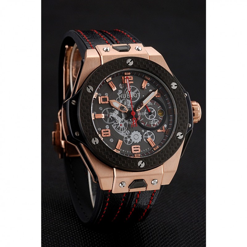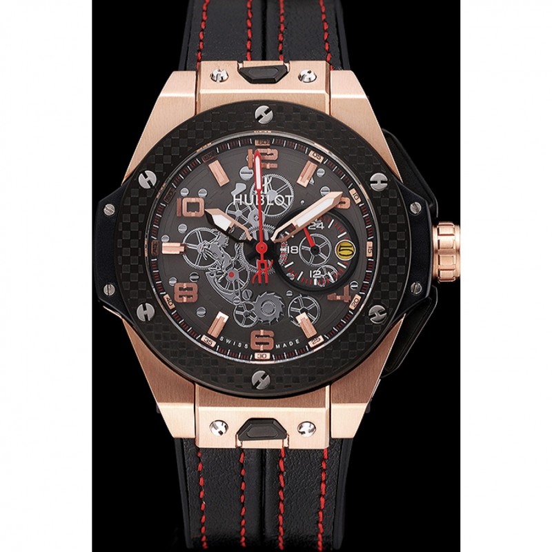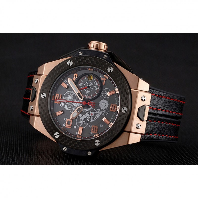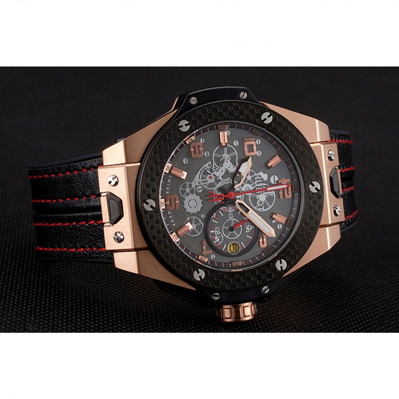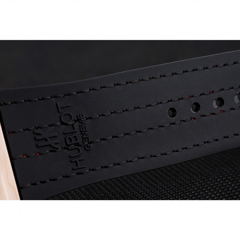 Crown>braccialetto: logo e calore impresso cinturino in pelle nera Hublot Geneve con cuciture filo rosso e Hublot Geneve incisa placcato 18k oro rosa catenaccio del gancio spingere release
