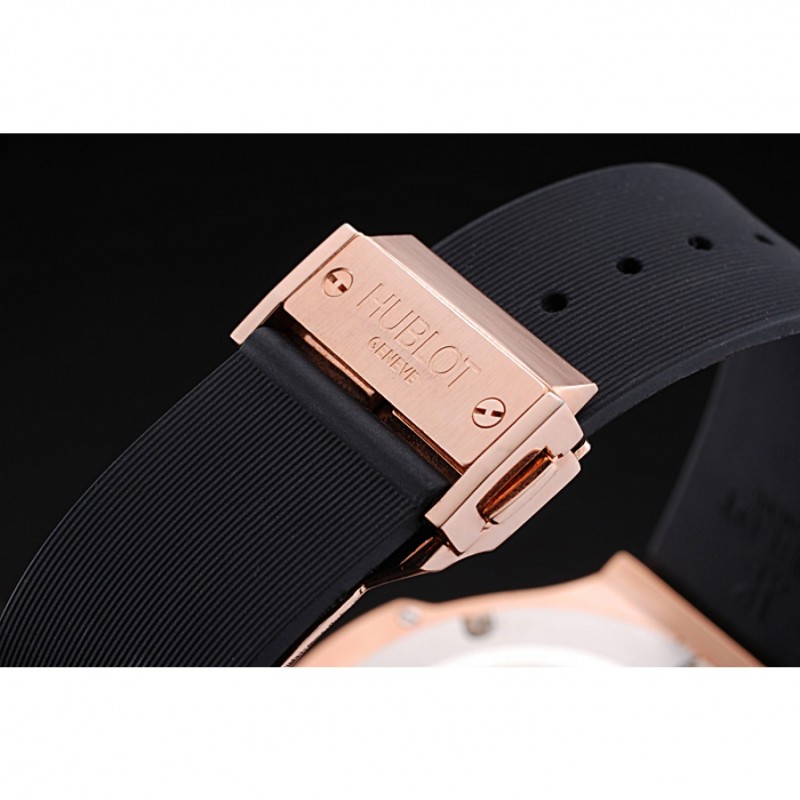 braccialetto: calore logo in rilievo e Hublot Geneve costine cinturino in gomma nera con Hublot Geneve incisa placcato fold-over oro rosa catenaccio del gancio spingere release