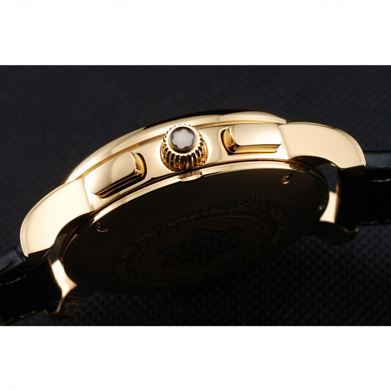 Crown: Montblanc logo caratterizzato placcato 18k oro giallo corona intaglio con un pulsante rettangolare corona su entrambi i lati di esso