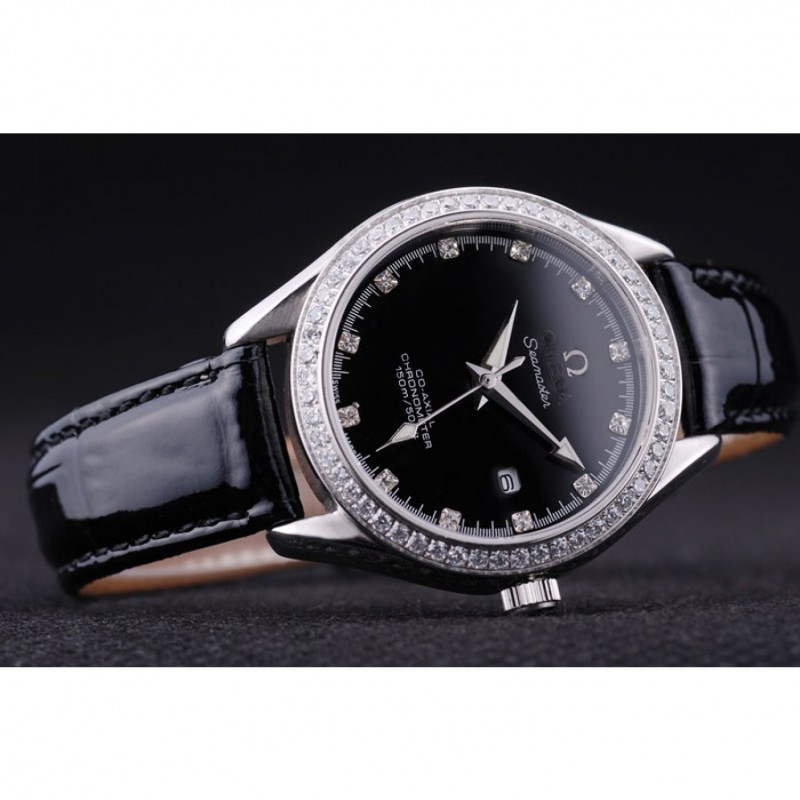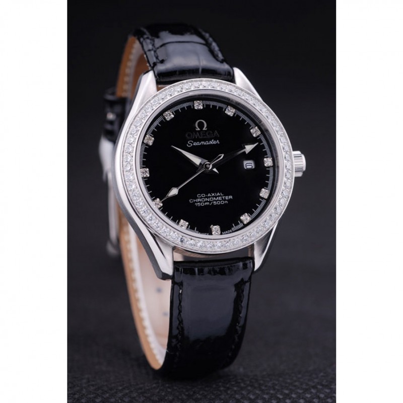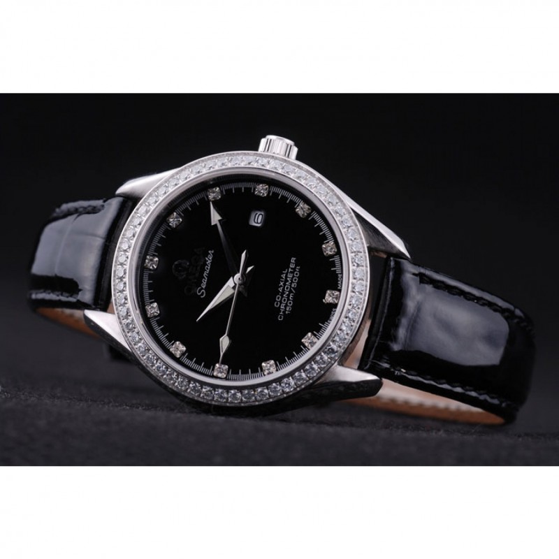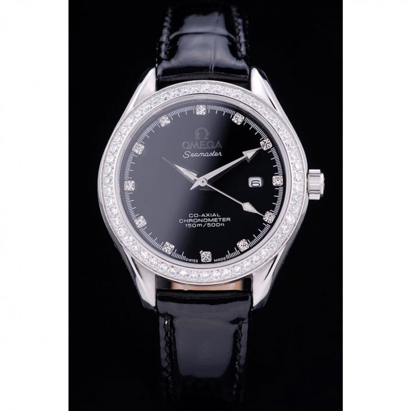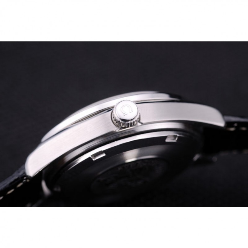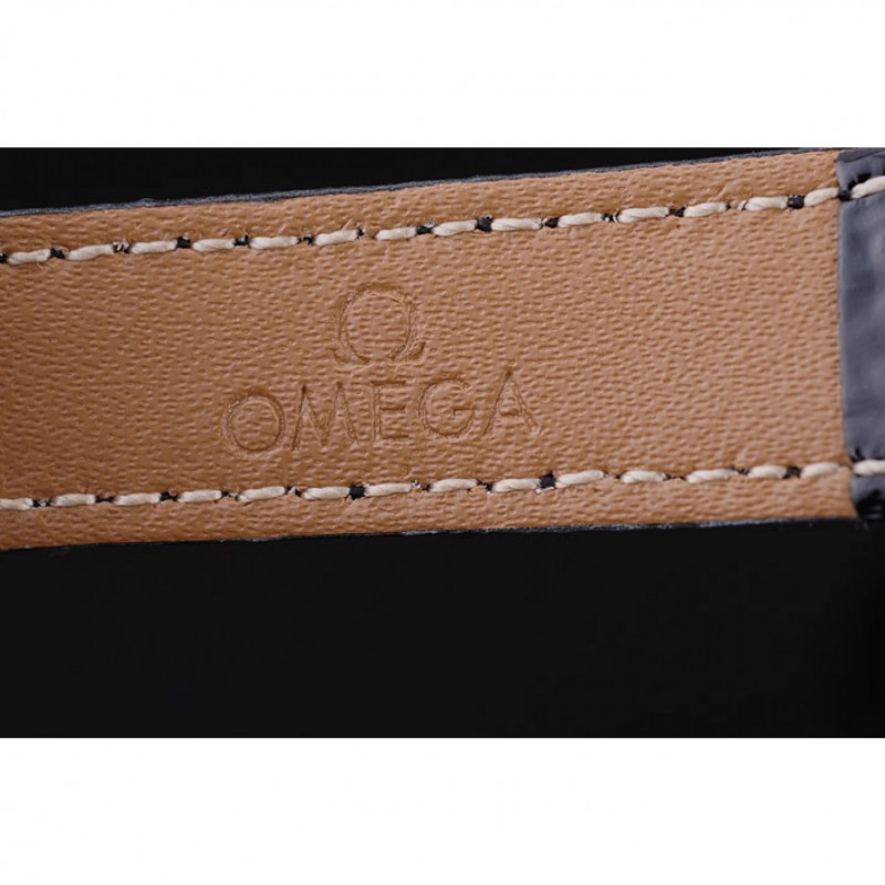 Bracciale: cinturino in pelle di coccodrillo verniciata nera calore Omega in rilievo con Omega inscritto in acciaio inox gancio-fibbia chiusura lucidato