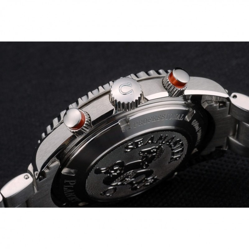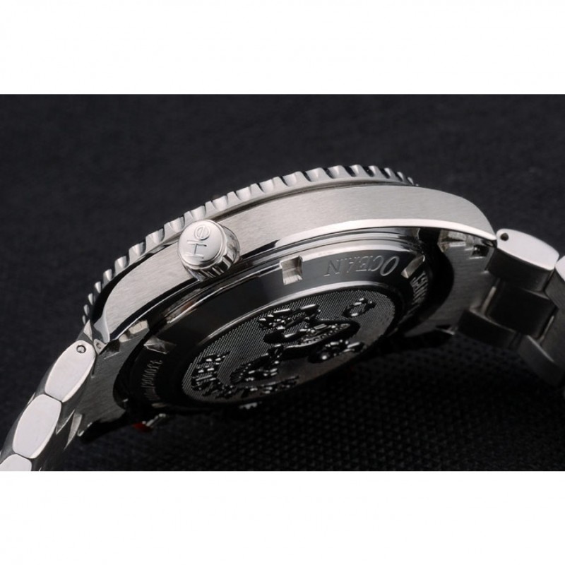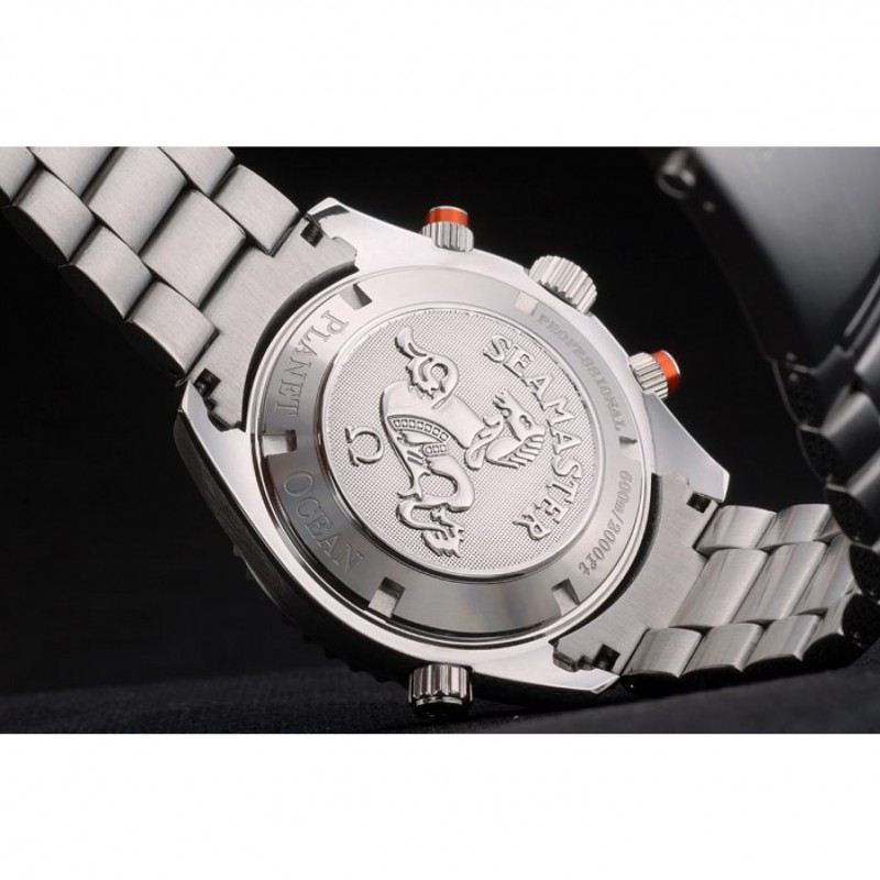 Torna: in acciaio inox lucidato a scatto sul retro con il logo Omega e incisioni Planet Ocean Seamaster