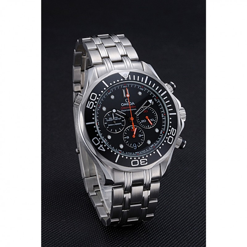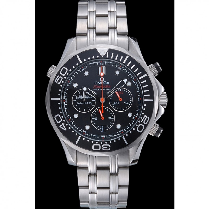 Corona: Omega logo inciso lucido corona intaglio in acciaio inossidabile con la striscia di smalto nero pulsante rotondo corona su entrambi i lati di esso, più un logo inciso lucido corona intaglio in acciaio inox su all’angolo opposto top