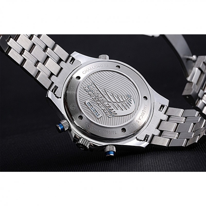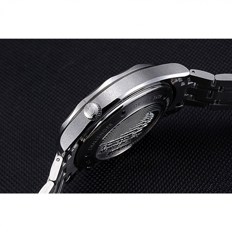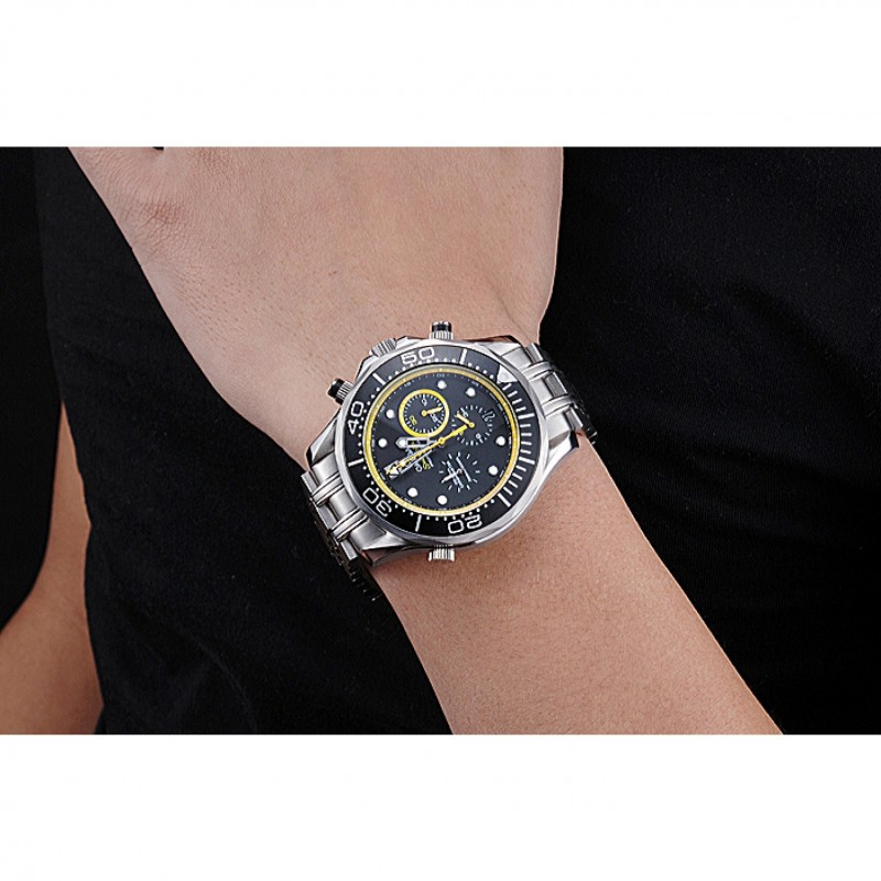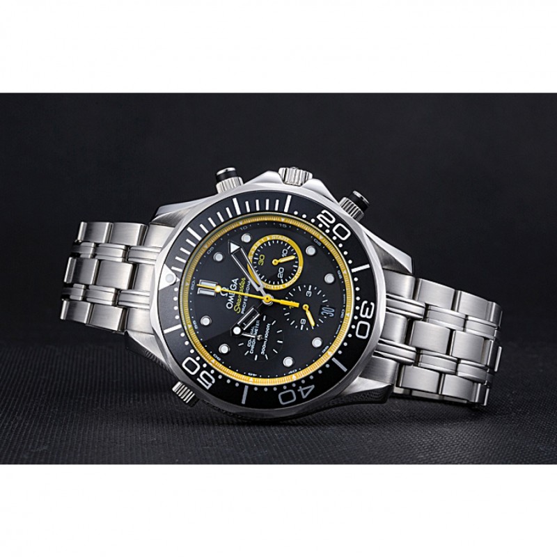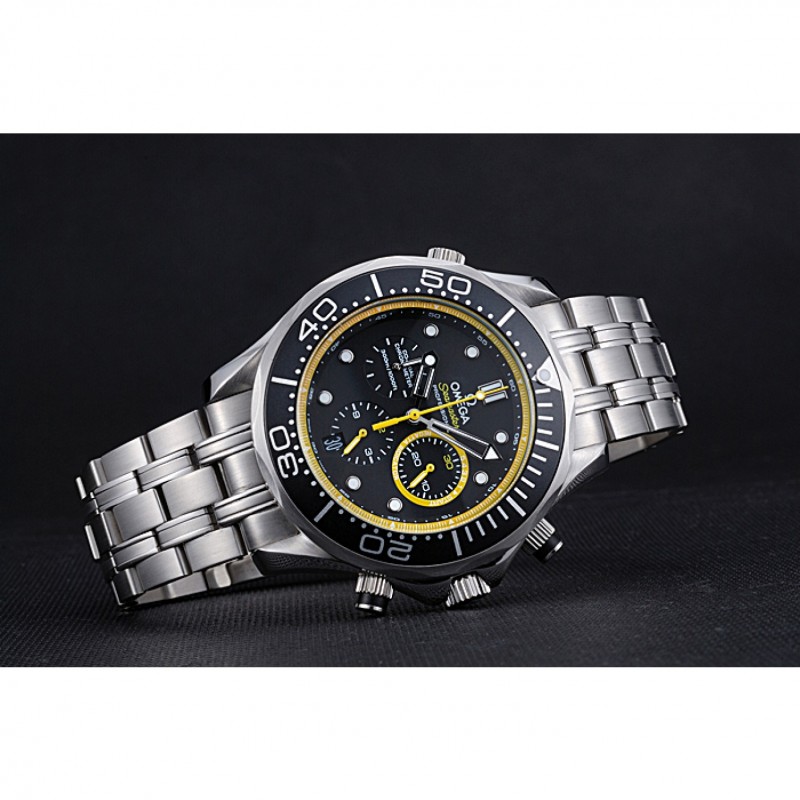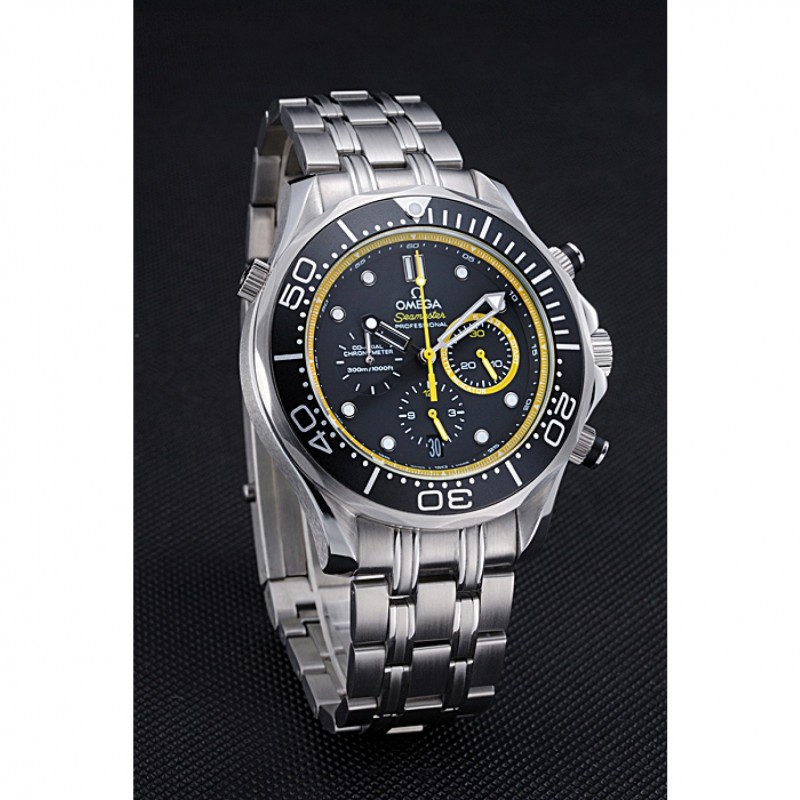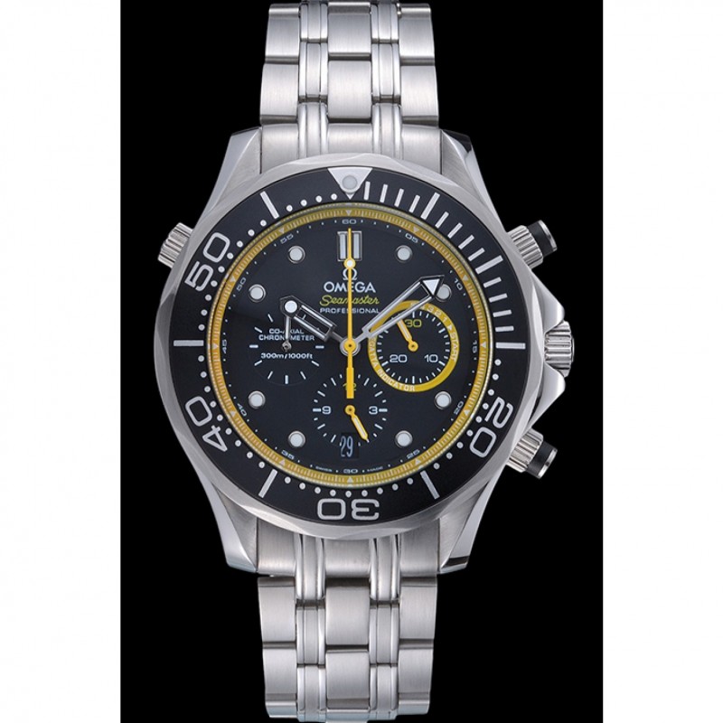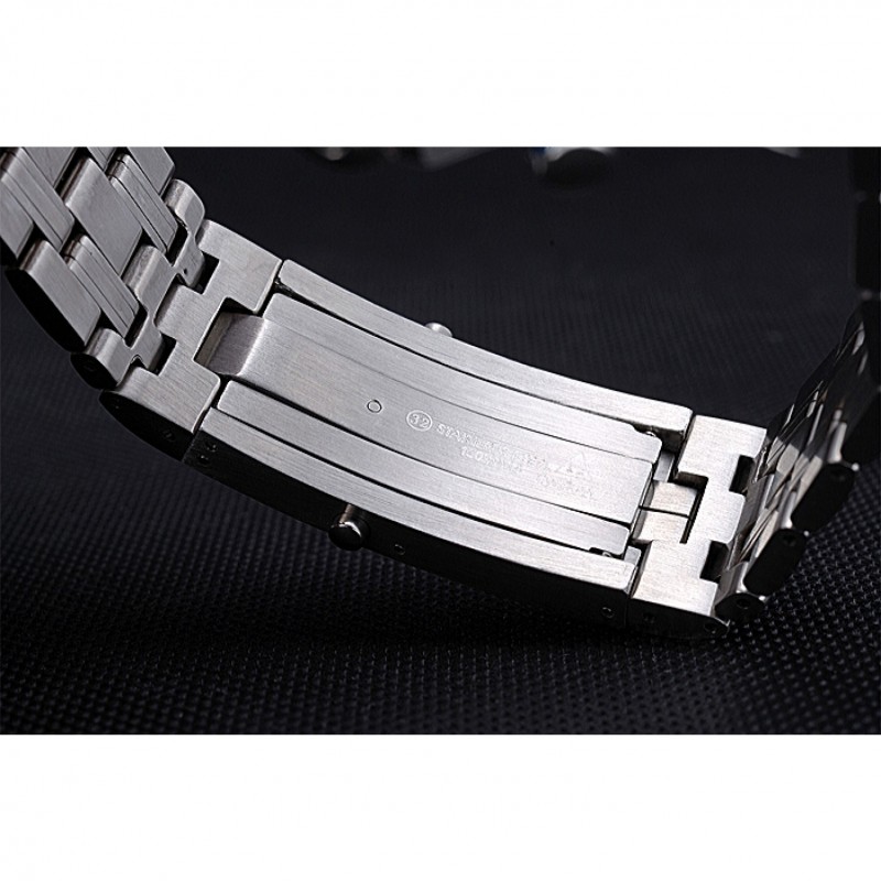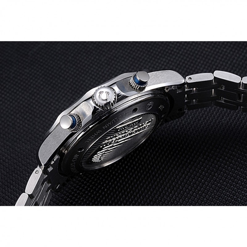 Corona: Omega logo inciso lucido corona intaglio in acciaio inossidabile con la striscia di smalto nero pulsante rotondo corona su entrambi i lati di esso, più un logo inciso lucido corona intaglio in acciaio inox su all’angolo opposto top