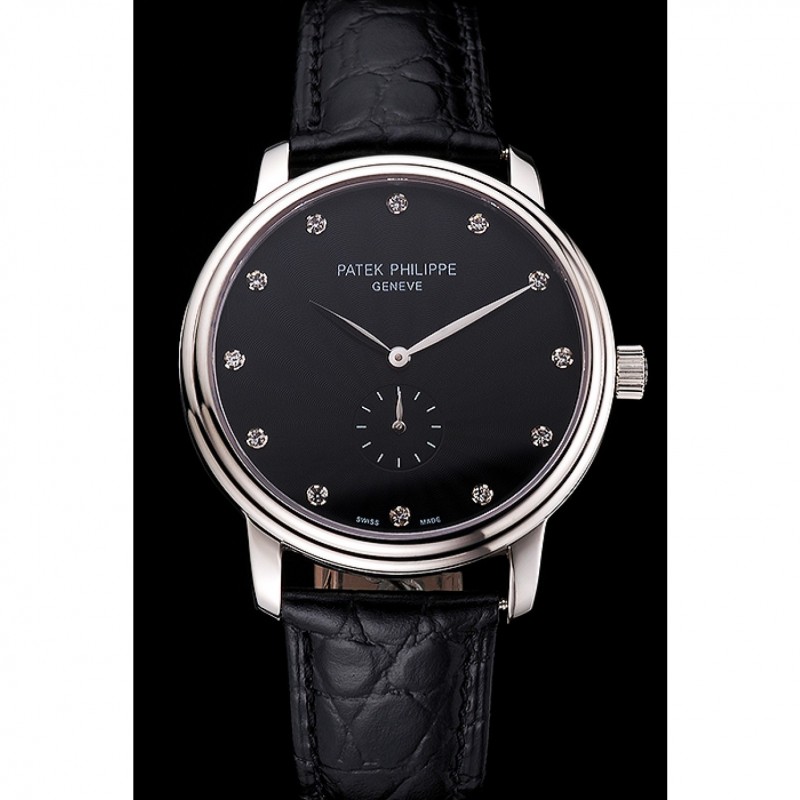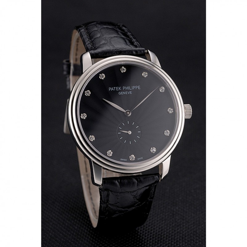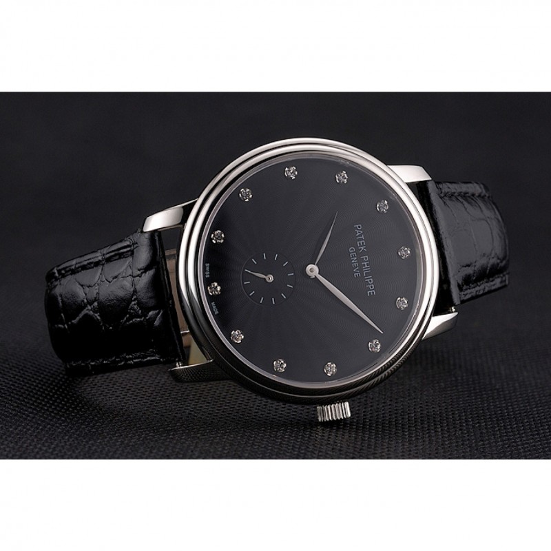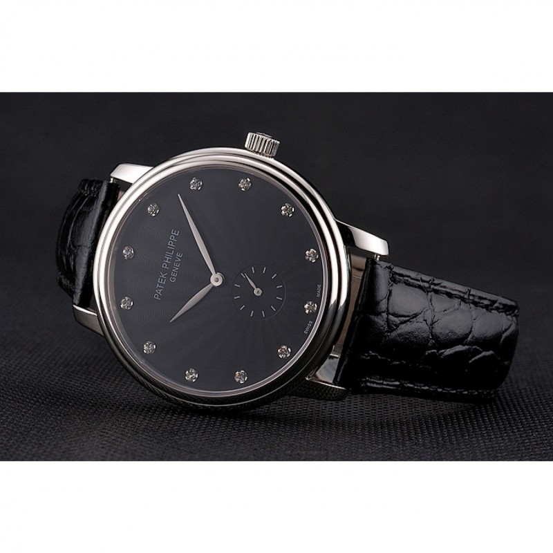 Prodotto: Patek Philippe Calatrava, quadrante nero, cassa in acciaio nero, cinturino in pelle.