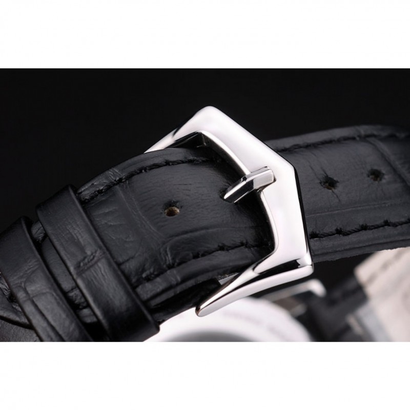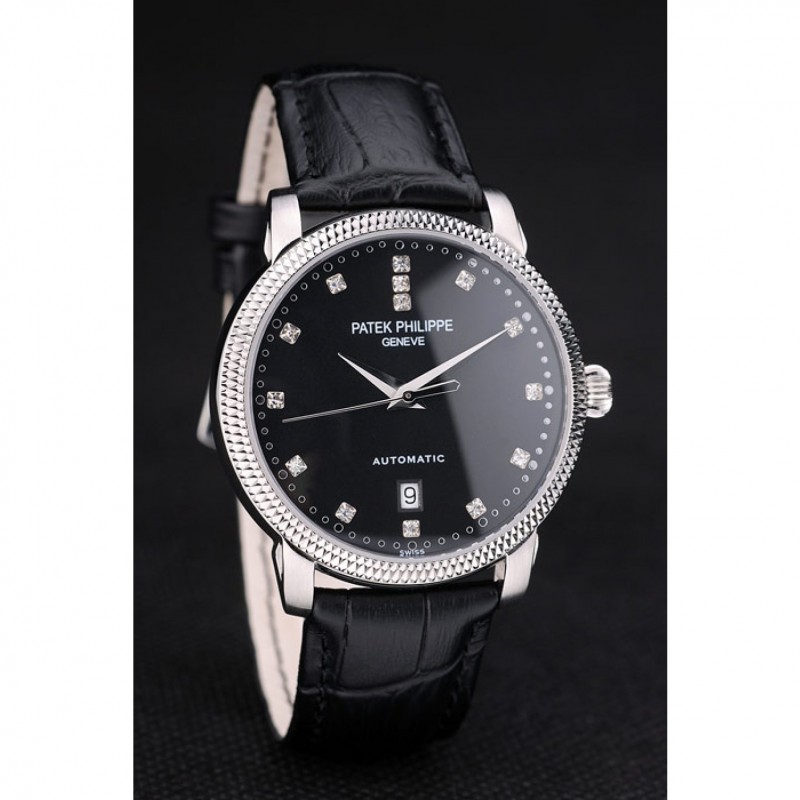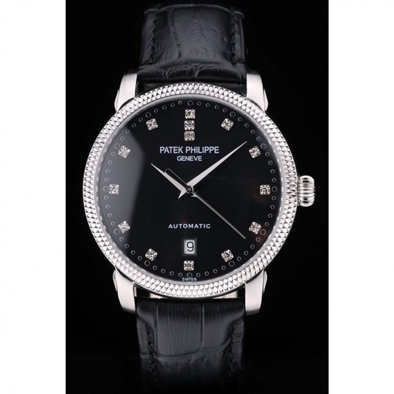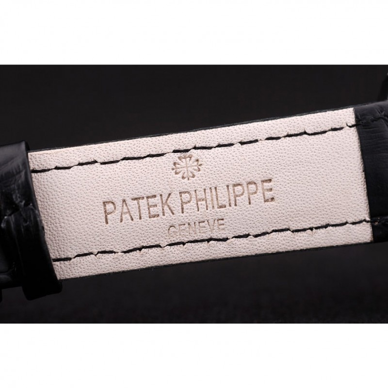 Bracciale: logo, Patek Philippe Geneve calore impresso cinturino in pelle di coccodrillo nera con Patek Philippe e logo inciso fibbia in acciaio inox lucido gancio-fibbia