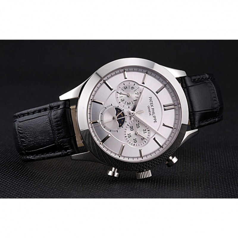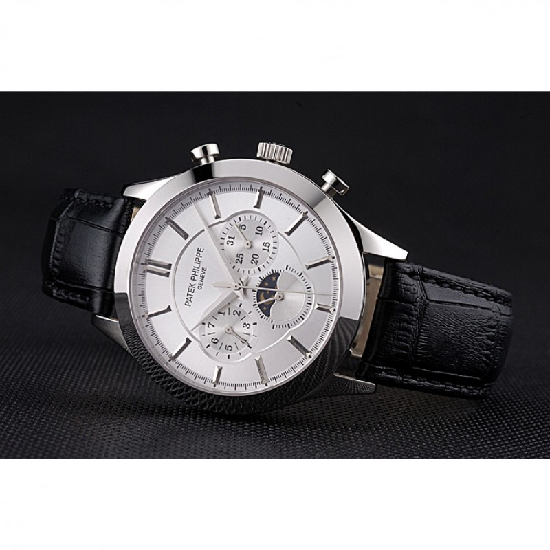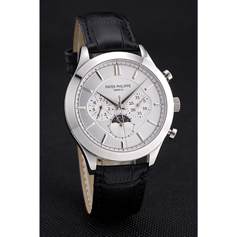 Patek Philippe Chronograph Moonphase quadrante bianco Cassa in acciaio cinturino in pelle nera 622.841