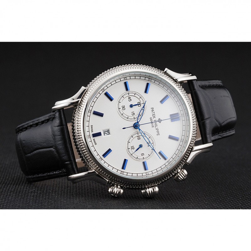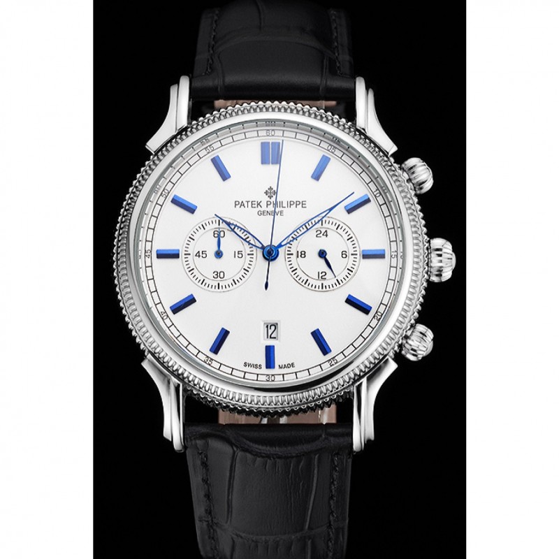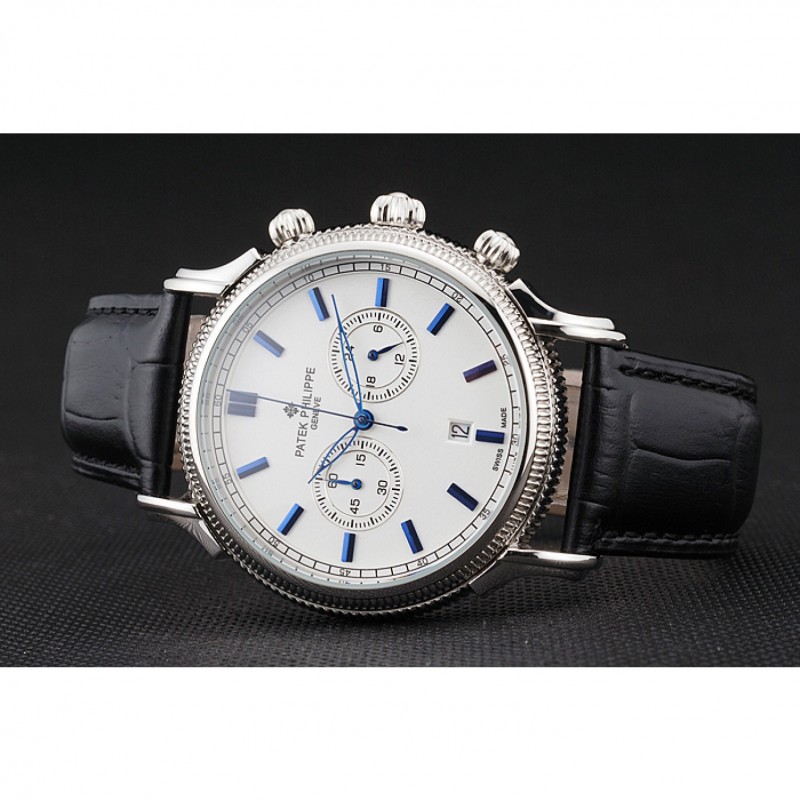 Patek Philippe Chronograph quadrante bianco blu Marcature Cassa in acciaio nero cinturino in pelle