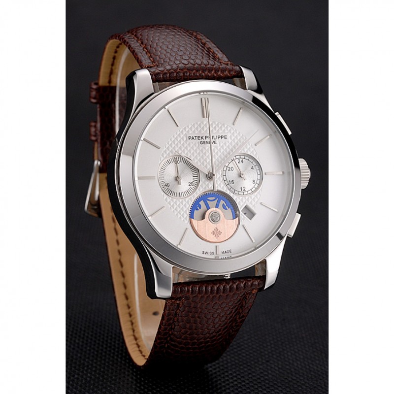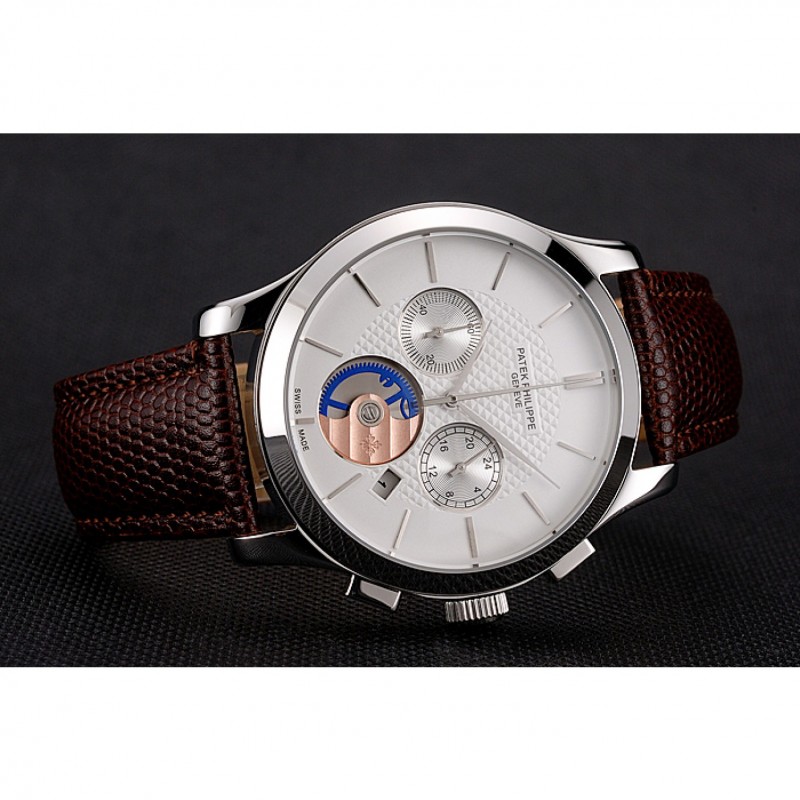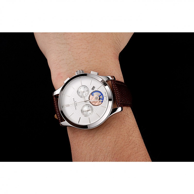 Patek Philippe Chronograph quadrante bianco Cassa in acciaio cinturino in pelle marrone