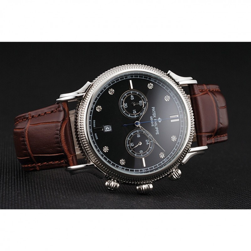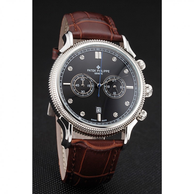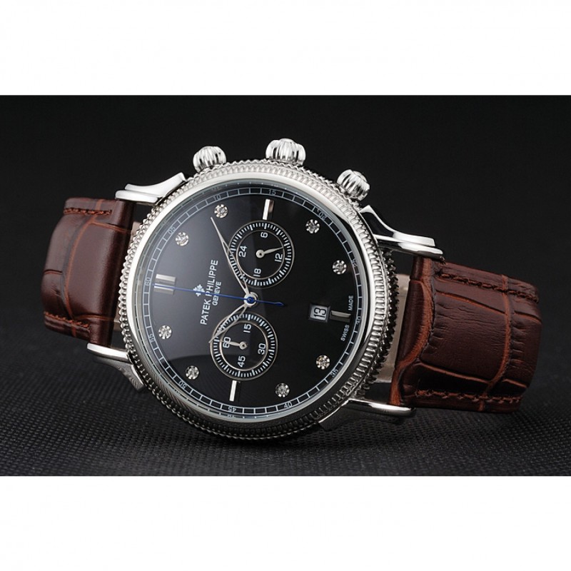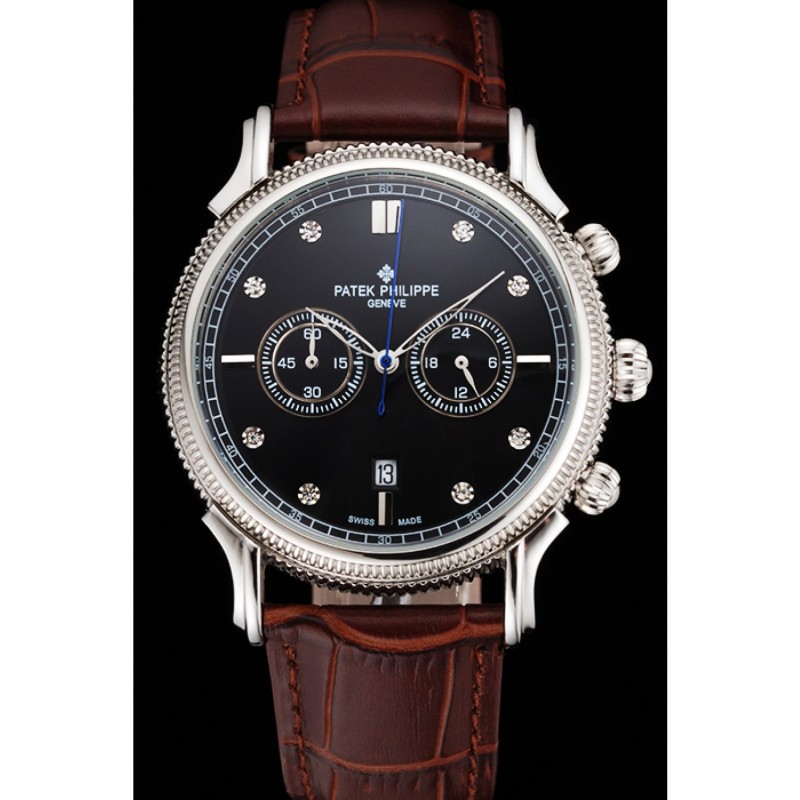Patek Philippe Chronograph quadrante nero con diamanti Cassa in acciaio cinturino in pelle marrone
