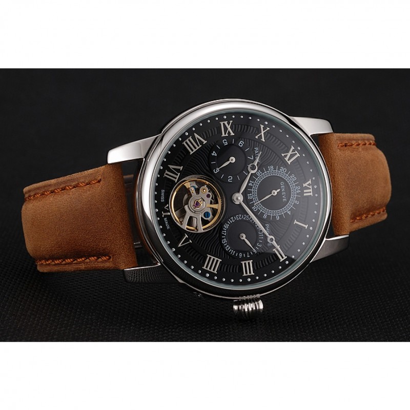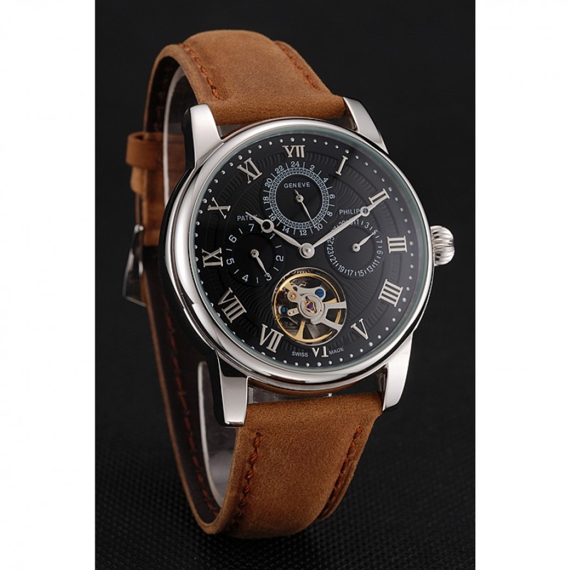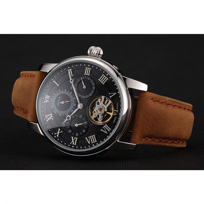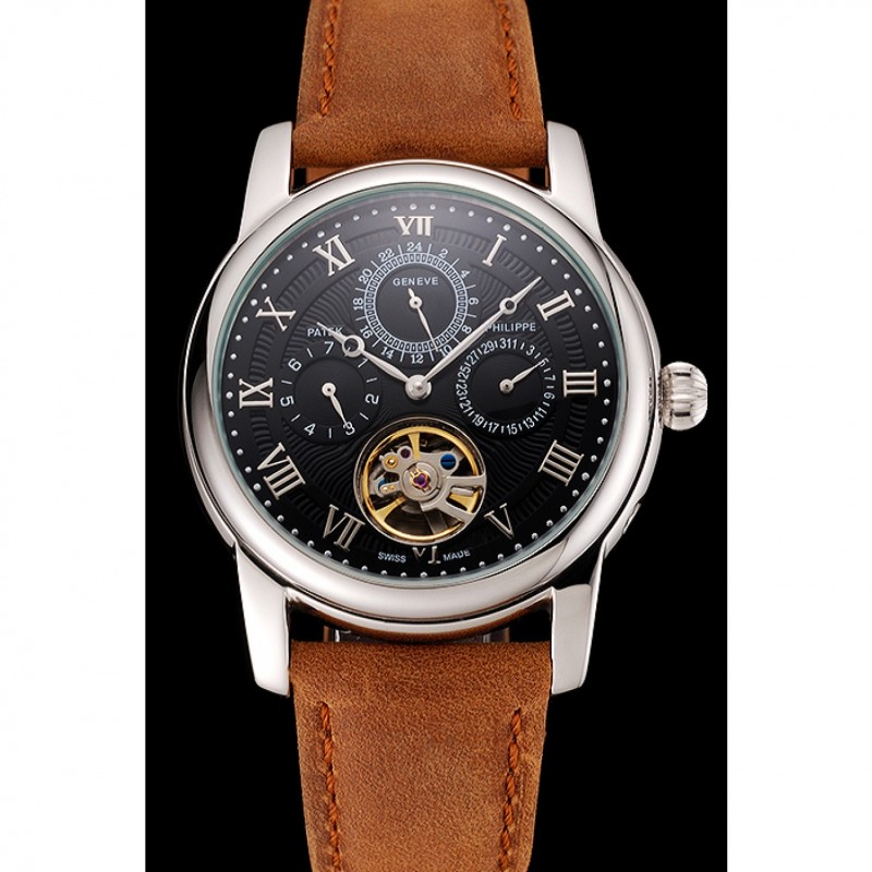 Patek Philippe Grand Complicazioni Giorno Data Tourbillon quadrante nero numeri Cassa in acciaio Camoscio Marrone Cinturino in pelle 1453816