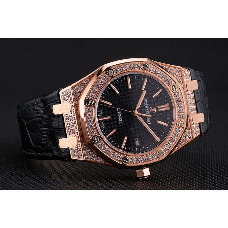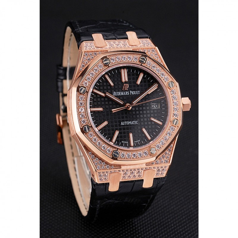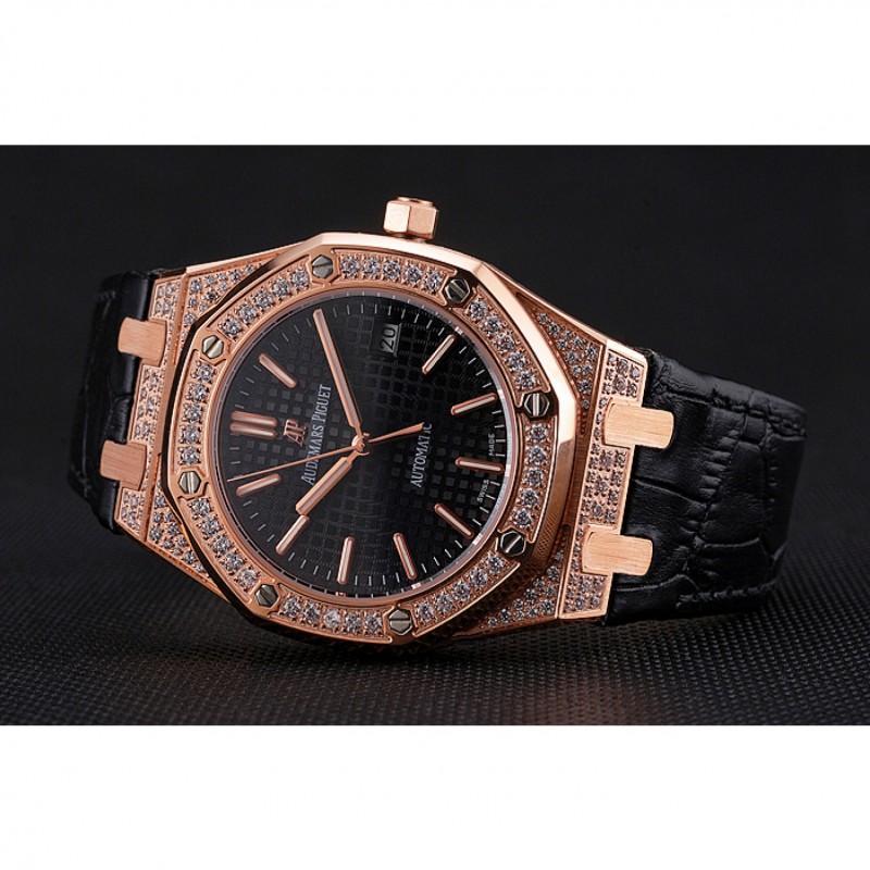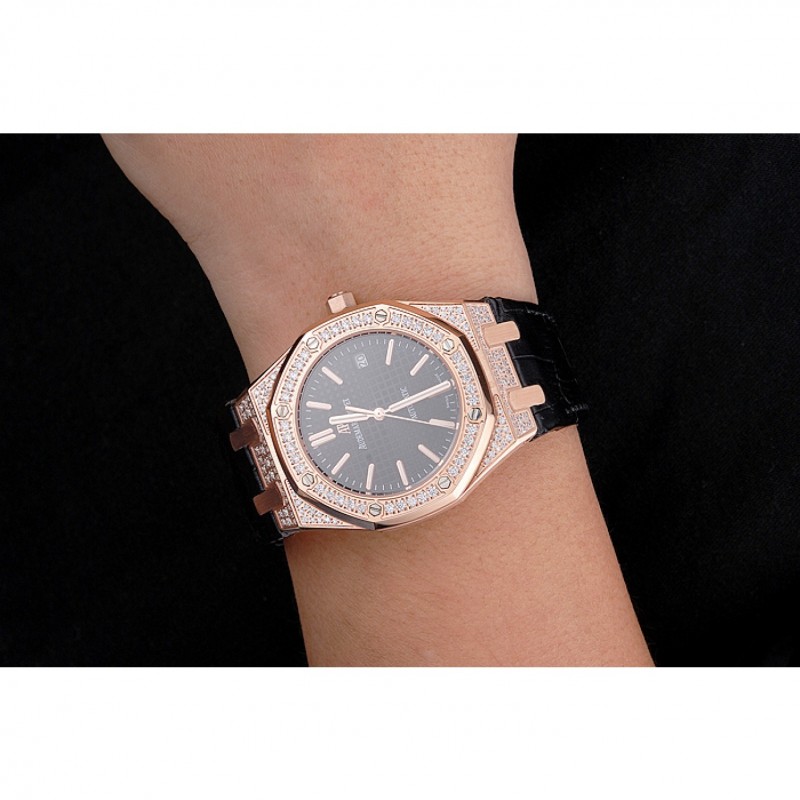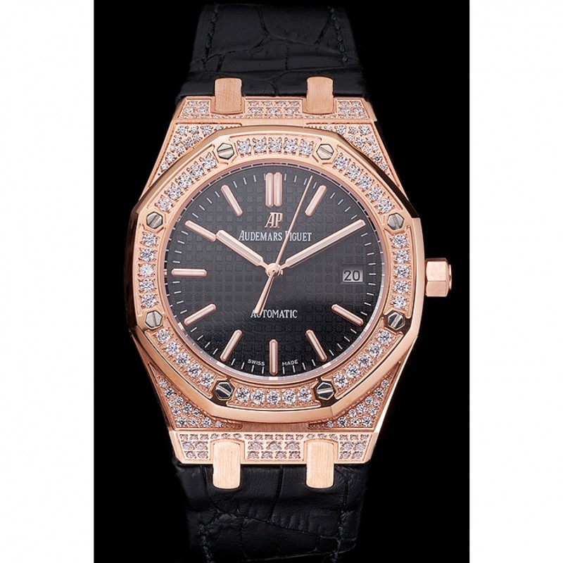 Svizzera Audemars Piguet Royal Oak Quadrante nero cassa in oro con diamanti cinturino in pelle nera