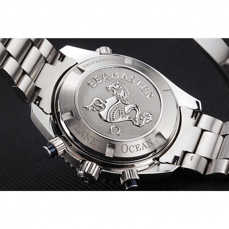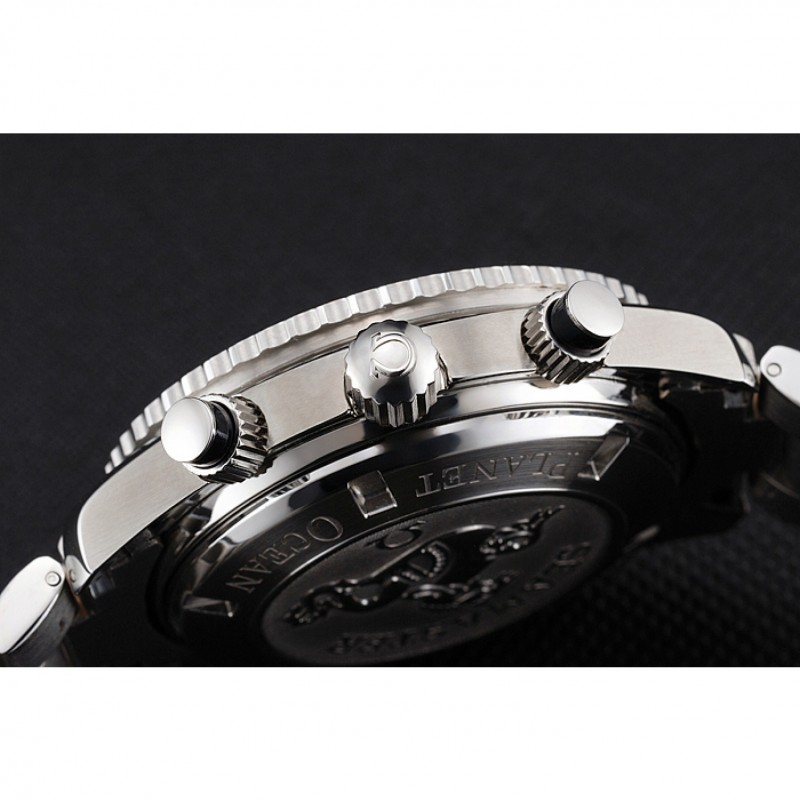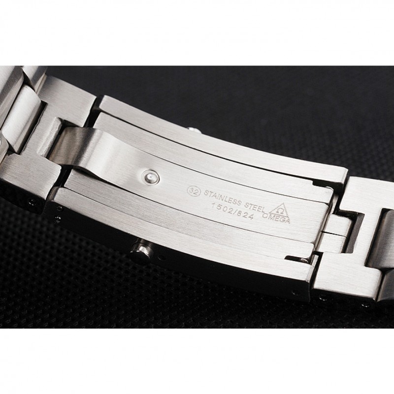 Corona: Omega logo intagliato lucido corona intaglio in acciaio inossidabile con un nero trim di ceramica pulsante corona su entrambi i lati di esso, più una corona intaglio sul lato opposto