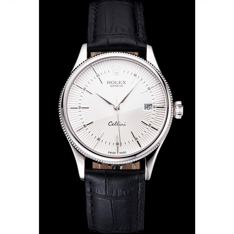 Svizzero Rolex Cellini Data quadrante bianco Cassa in acciaio nero cinturino in pelle