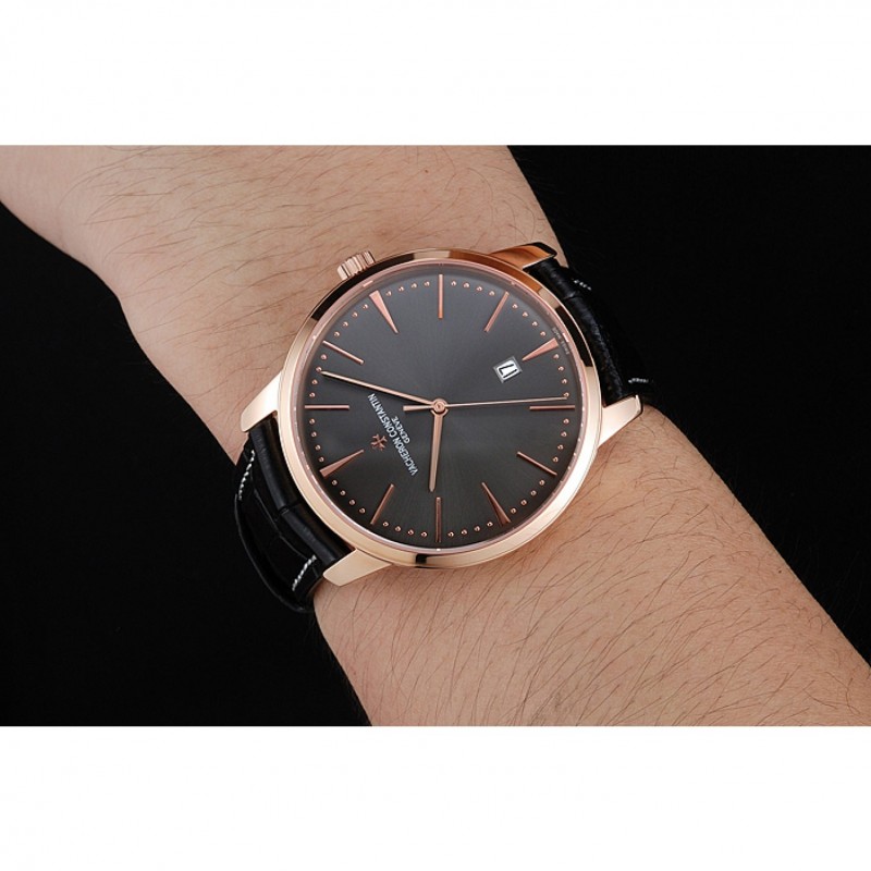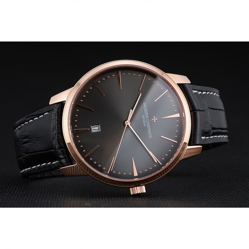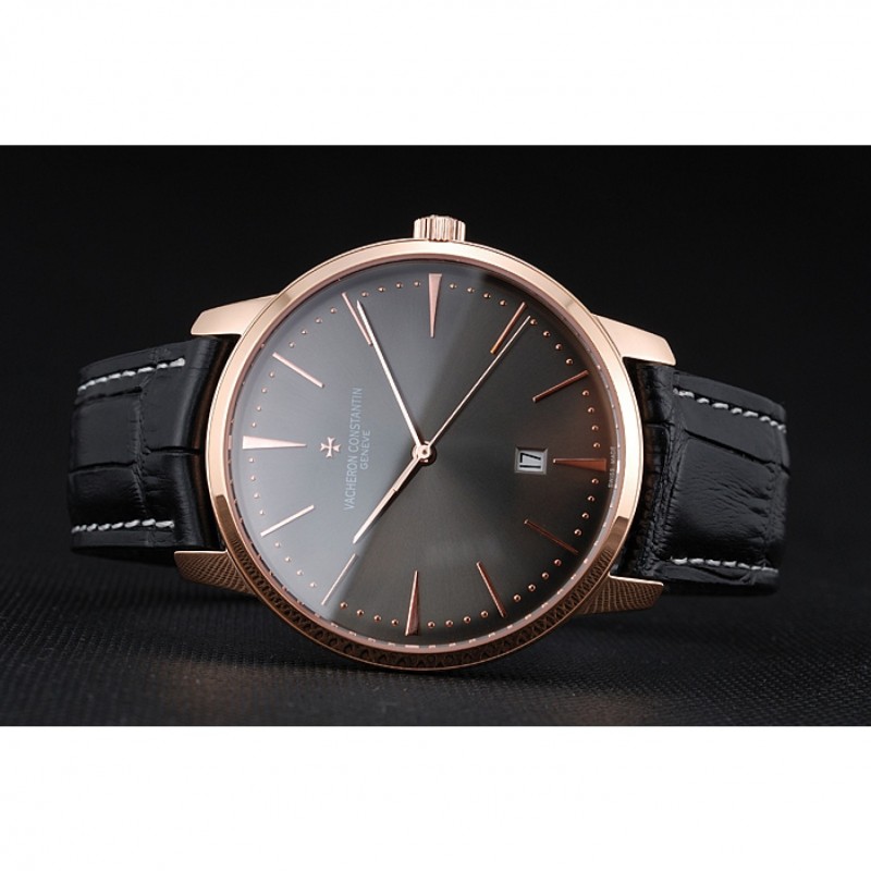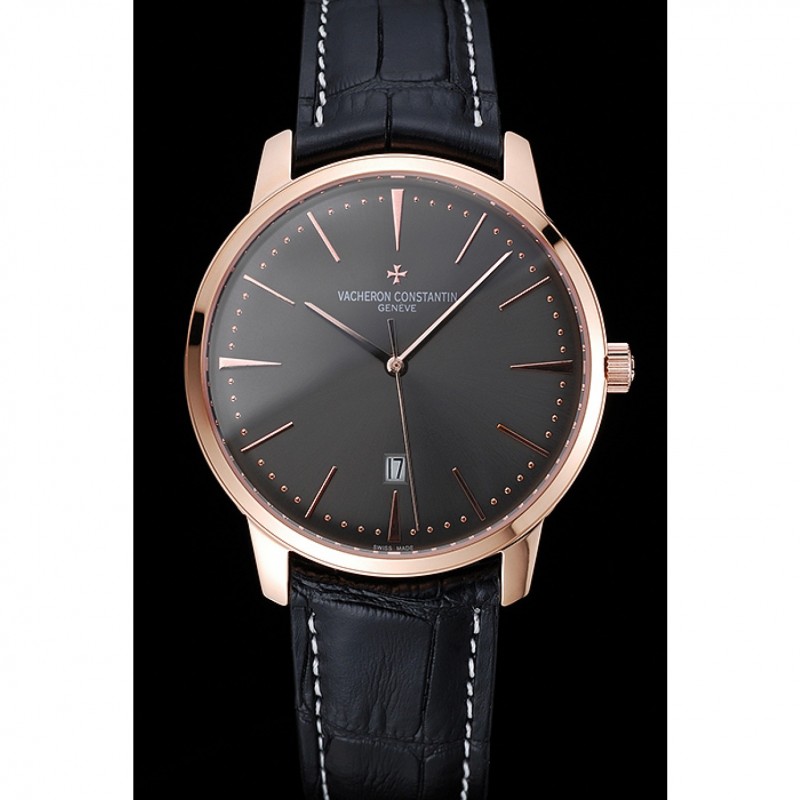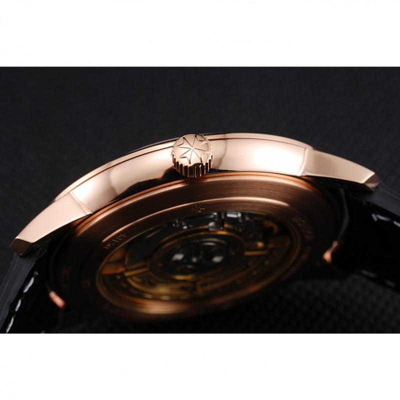 braccialetto: Vacheron Constantin e logo calore impresso cinturino in coccodrillo nero con cucitura in bianco filo e Vacheron Constantin logo intagliato 18k oro rosa placcato hook-fibbia chiusura
