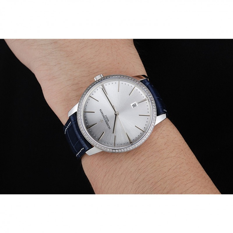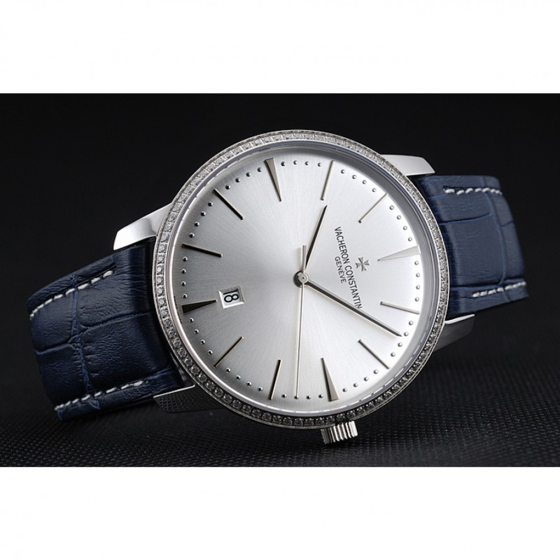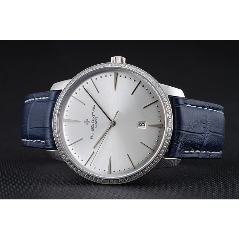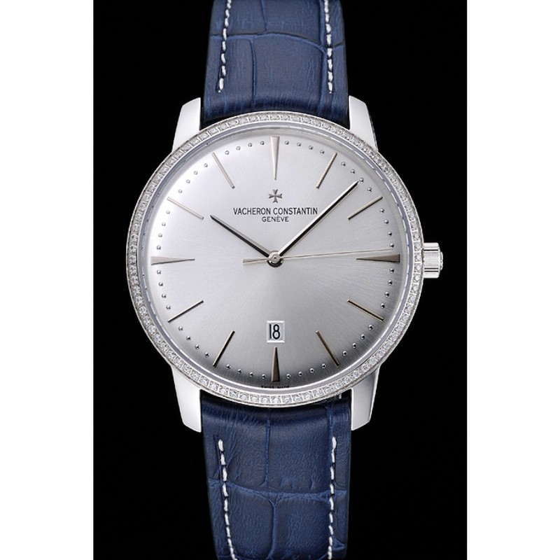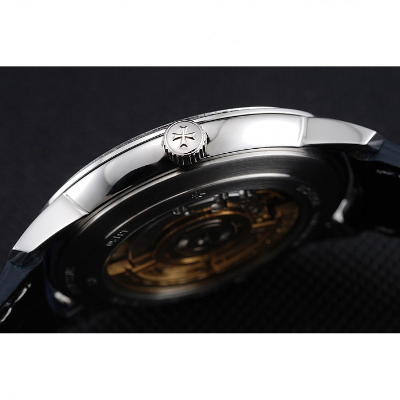 braccialetto: Vacheron Constantin e cinturino in pelle blu logo coccodrillo calore impresso con cuciture bianche filo e Vacheron Constantin logo intagliato inox catenaccio del gancio fibbia lucido