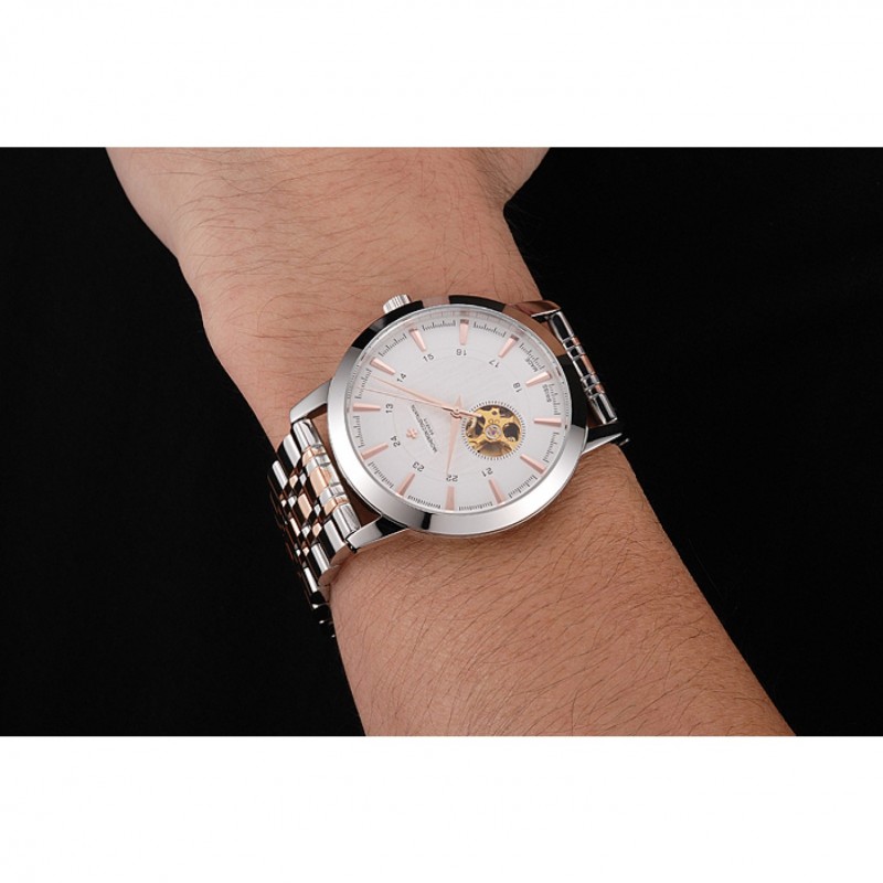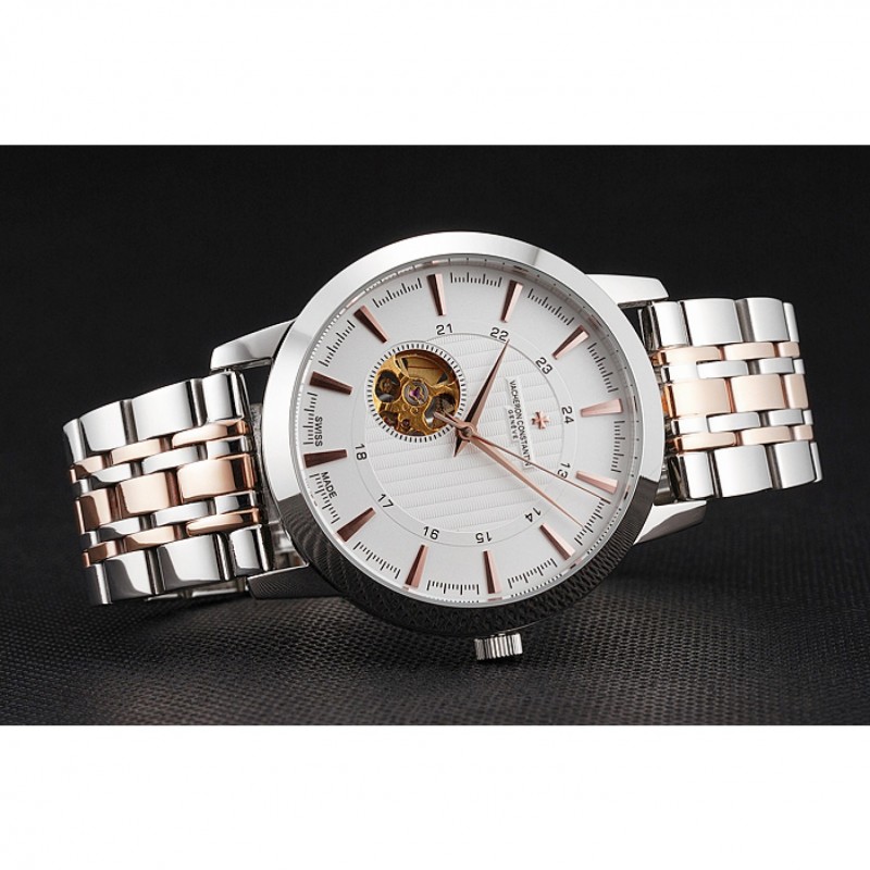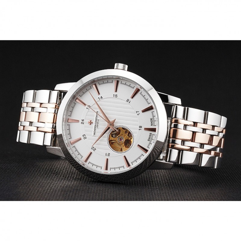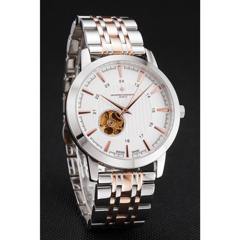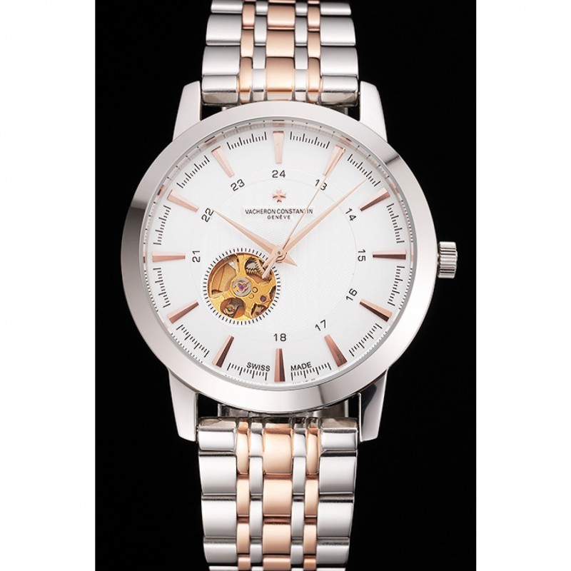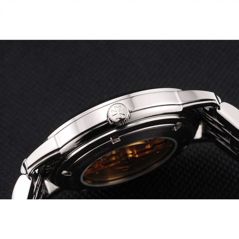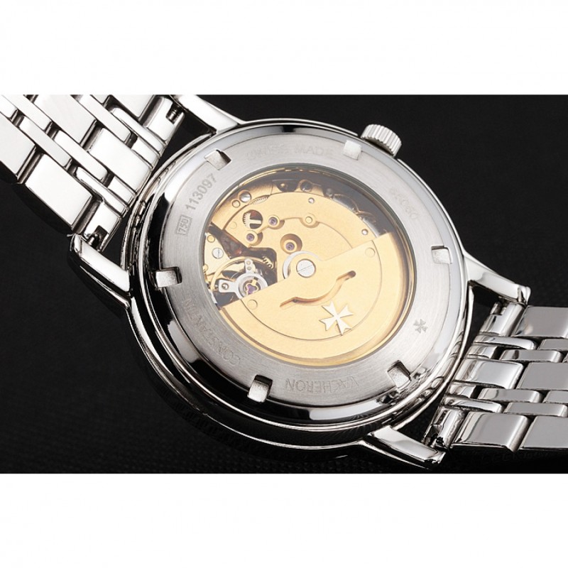 Torna: in acciaio inox lucido snap-in di nuovo con la meccanica trasparenti rivelando centro e Vacheron Constantin incisione logo
