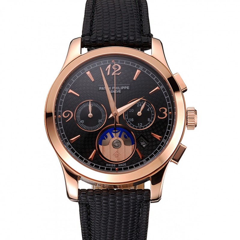 Patek Philippe Chronograph Nero guilloché cassa in oro rosa nera Cinturino in pelle
