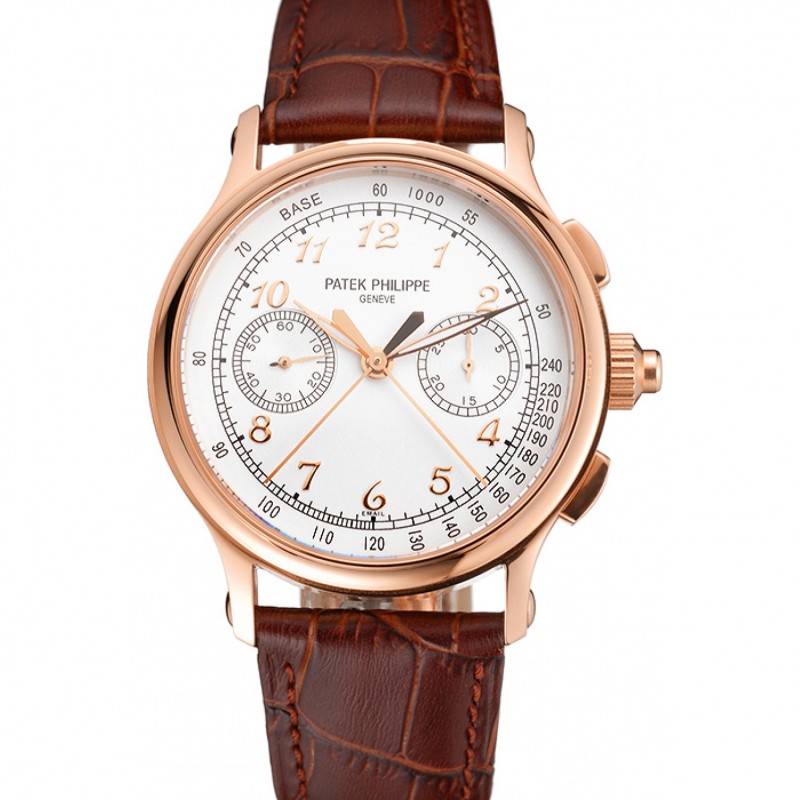 Secondi svizzera Patek Philippe Chronograph Split quadrante bianco cassa in oro rosa cinturino in pelle marrone