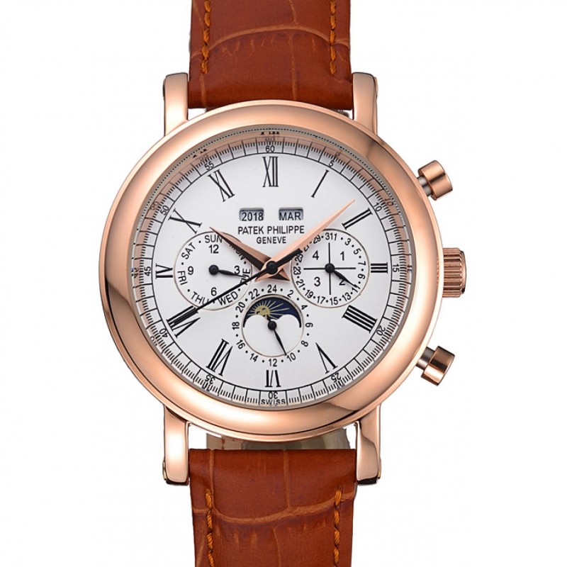 Patek Philippe Grand Complicazioni Dial braccialetto in pelle marrone Bianco Calendario Perpetuo