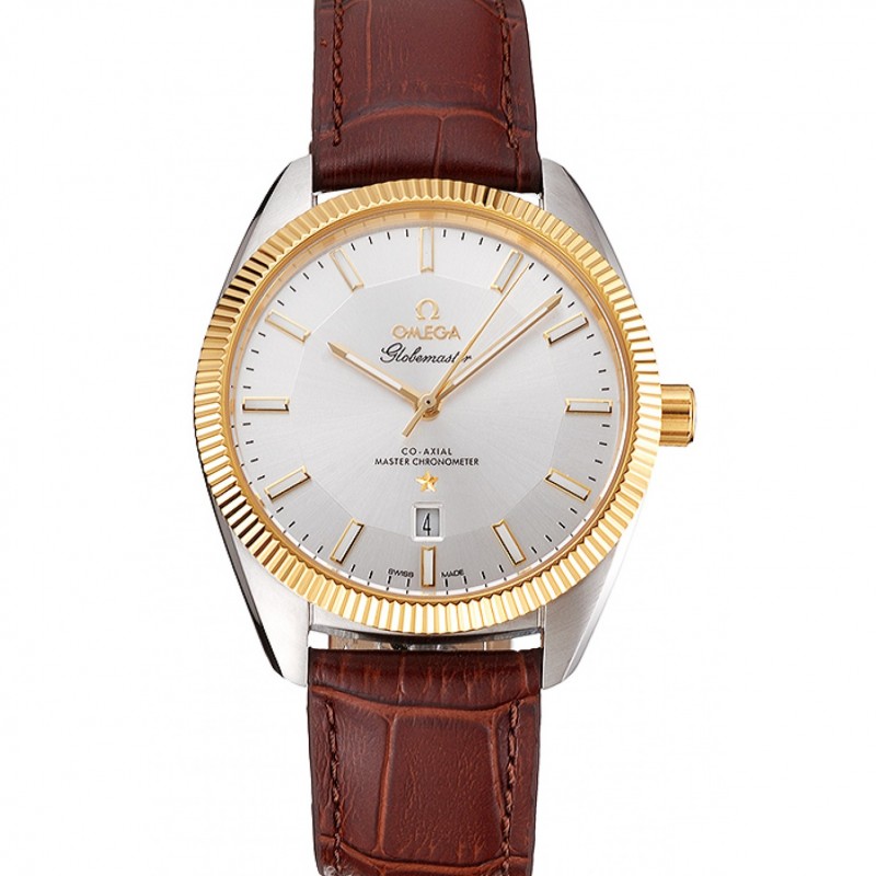Omega Globemaster Silver Dial lunetta in oro Cassa in acciaio cinturino in pelle marrone
