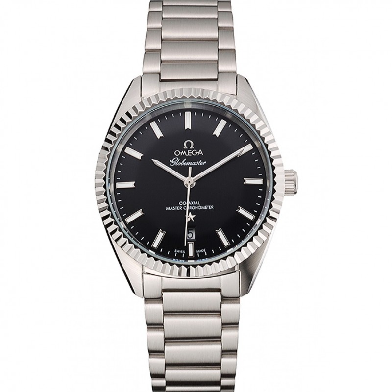 Omega Globemaster quadrante nero cassa in acciaio e bracciale