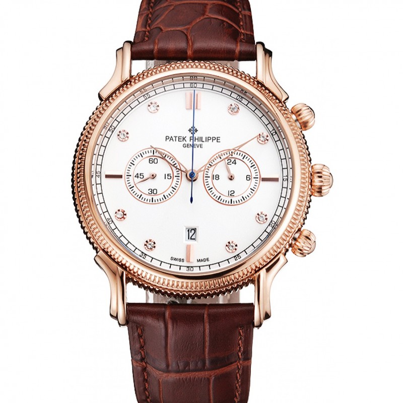 Patek Philippe Chronograph quadrante bianco con diamanti cassa in oro rosa cinturino in pelle marrone